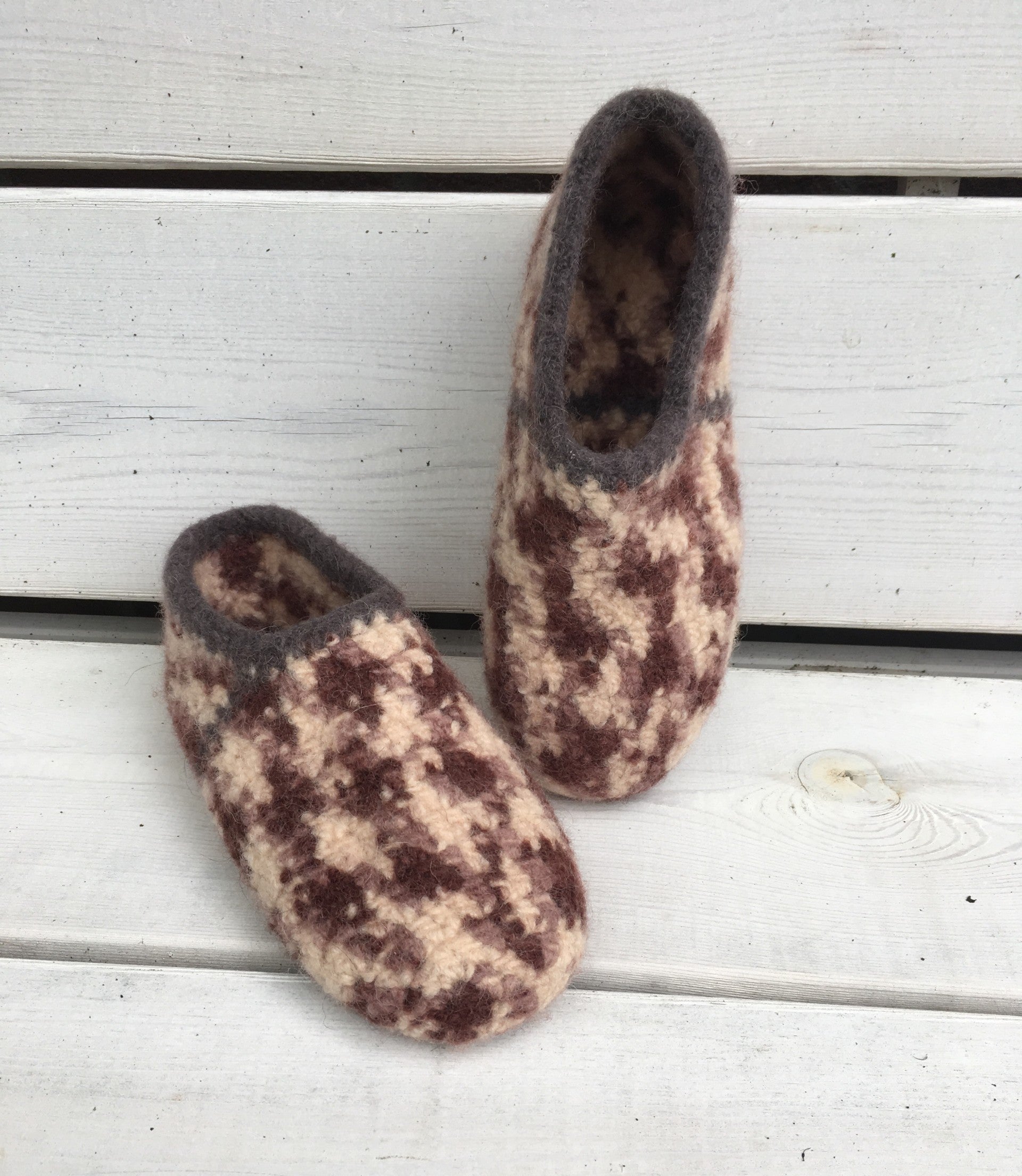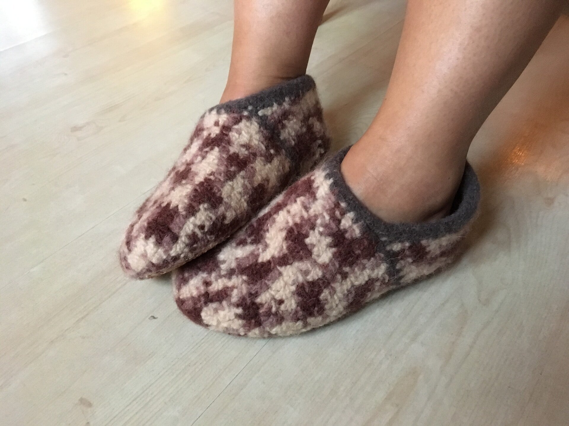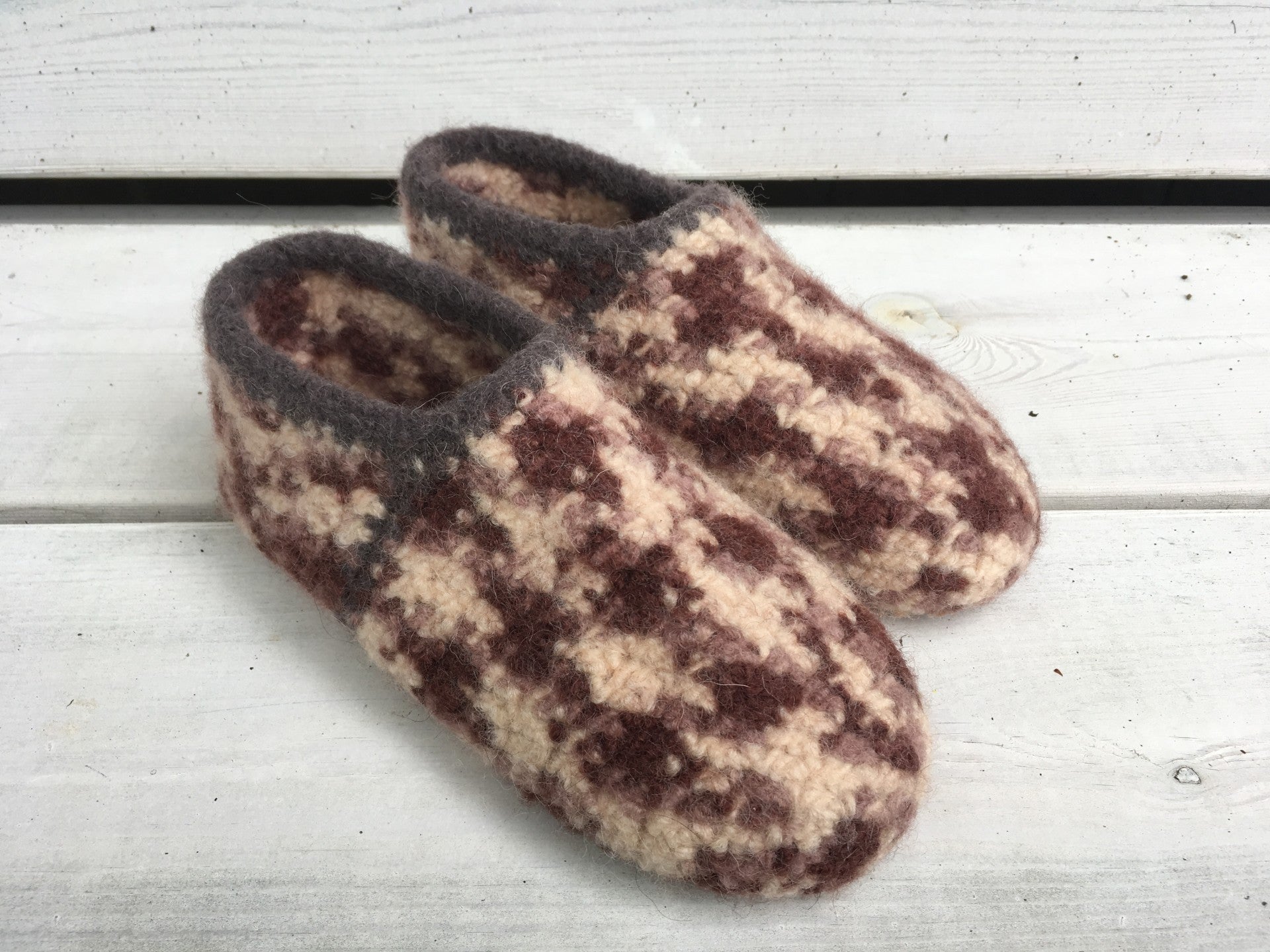 Gehaakt van 100% wol en erna gevilt en gedroogd op een mal op maat. Ze zijn daardoor super dik en warm, maar ademen ook.