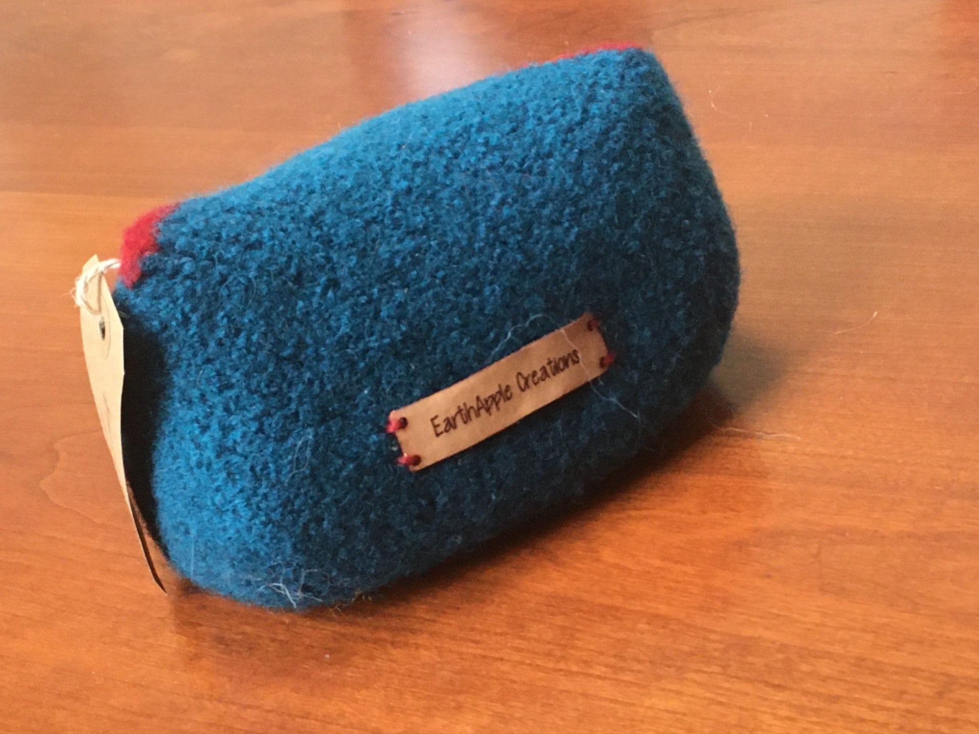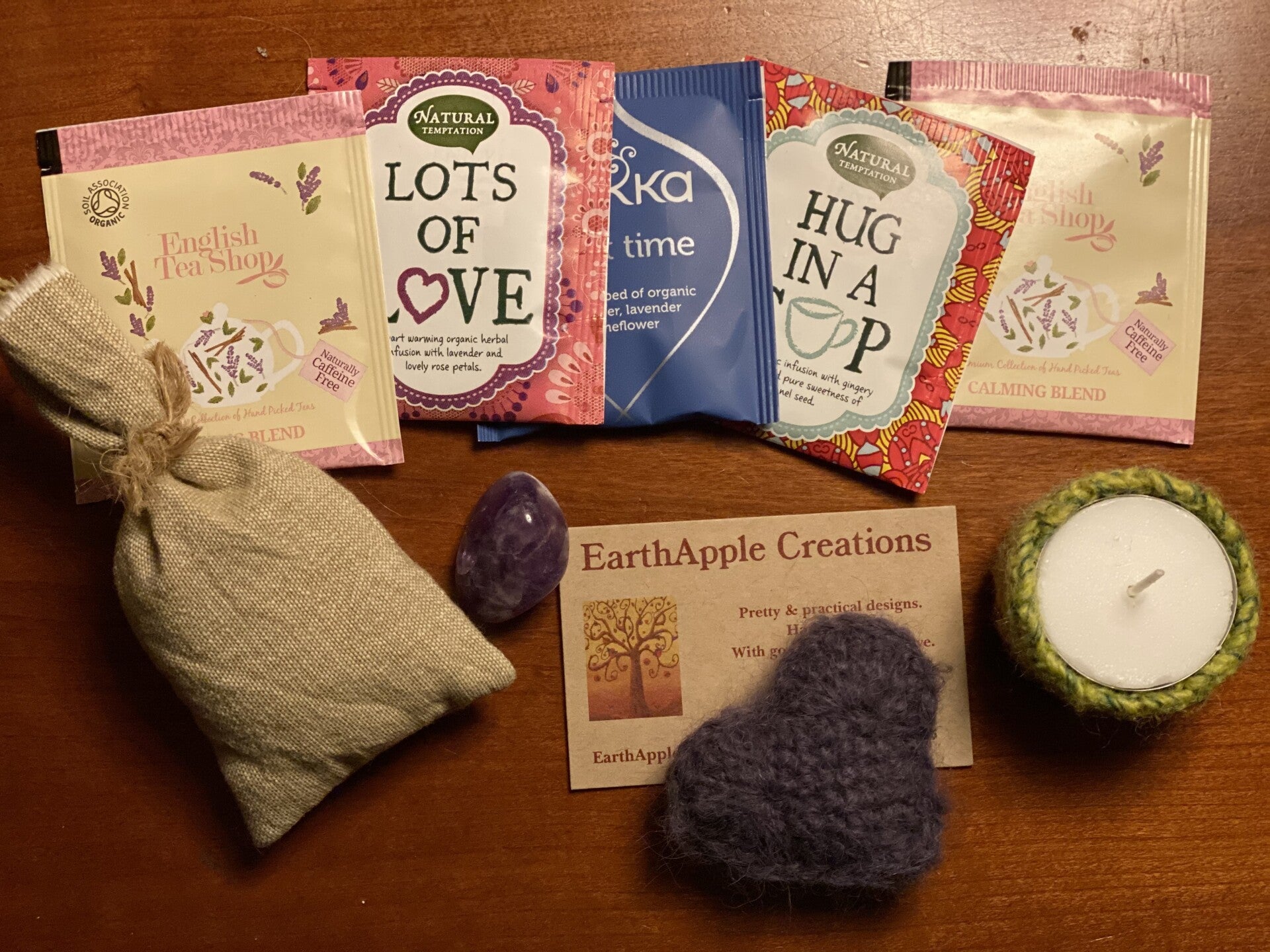 Het tasje zit vol met troost-dingen voor de zintuigen, net als het tasje ook handgemaakt of met zorg geselecteerd. Het tasje is gebreid van zuivere wol en erna gevilt. Hij sluit met een knoopje.