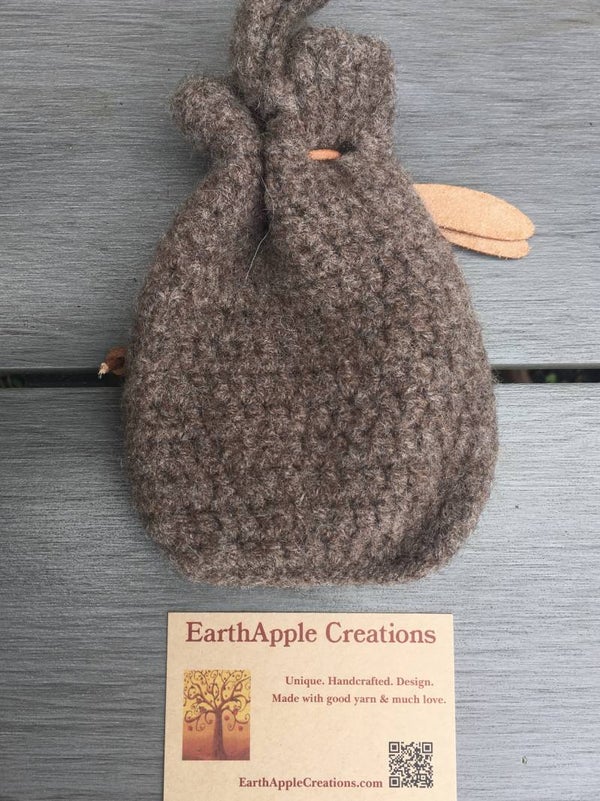 - Materials: Crocheted from 100% Icelandic wool, then felted. Cord = leather.