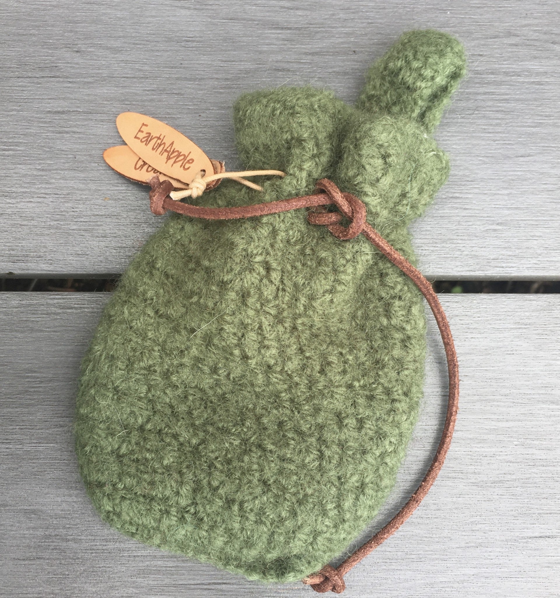 - Materials: Crocheted from 100% wool, then felted. Cord = leather.