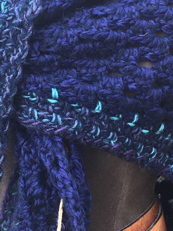 Driehoekige, middelgrote omslagdoek / sjaal, extreem zacht. Hij is diep donker blauw, met een rand met wat kleurtjes erin: een beetje turquoise, een klein beetje paars.