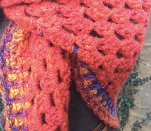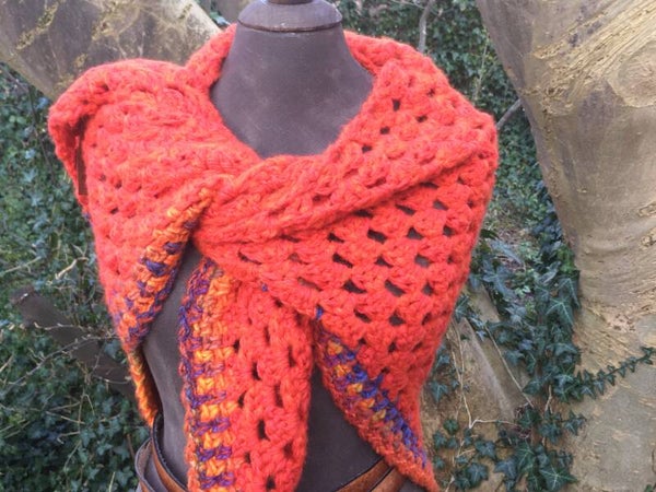 Heerlijke sjaal om vrolijk van te worden: de prachtige warme oranje-rode kleur met het montere randje doet denken aan Zuidelijke warmte en zon. Je kunt hem als omslagdoek gebruiken, maar ook als sjaal om de hals met de punt naar voren. Hij vormt makkelijk, en heeft extra lange 'vleugels' zodat de knoop blijft zitten.