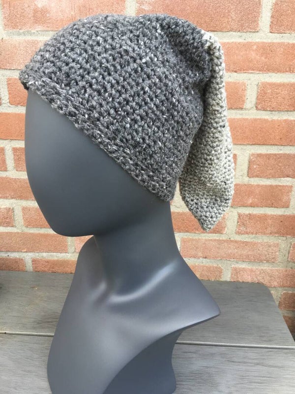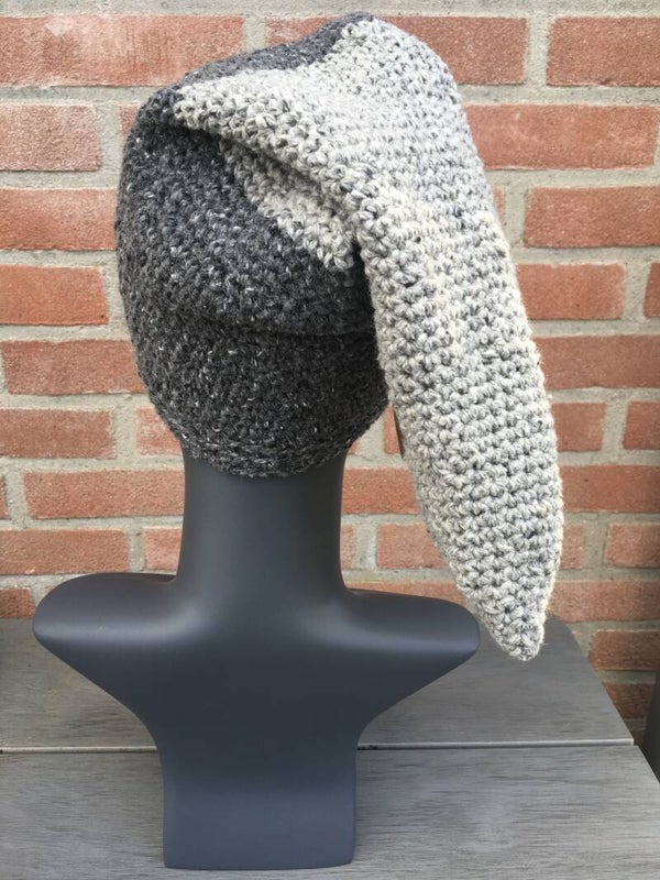 Wonderfully long, pointy beanie, shaped like the hats worn by Link in Zelda, and by the Danish "nisser": The little men and women who used to tease farmers, and who later, after the invention of Santa Claus, decided to help him. A whimsical beanie all in all.