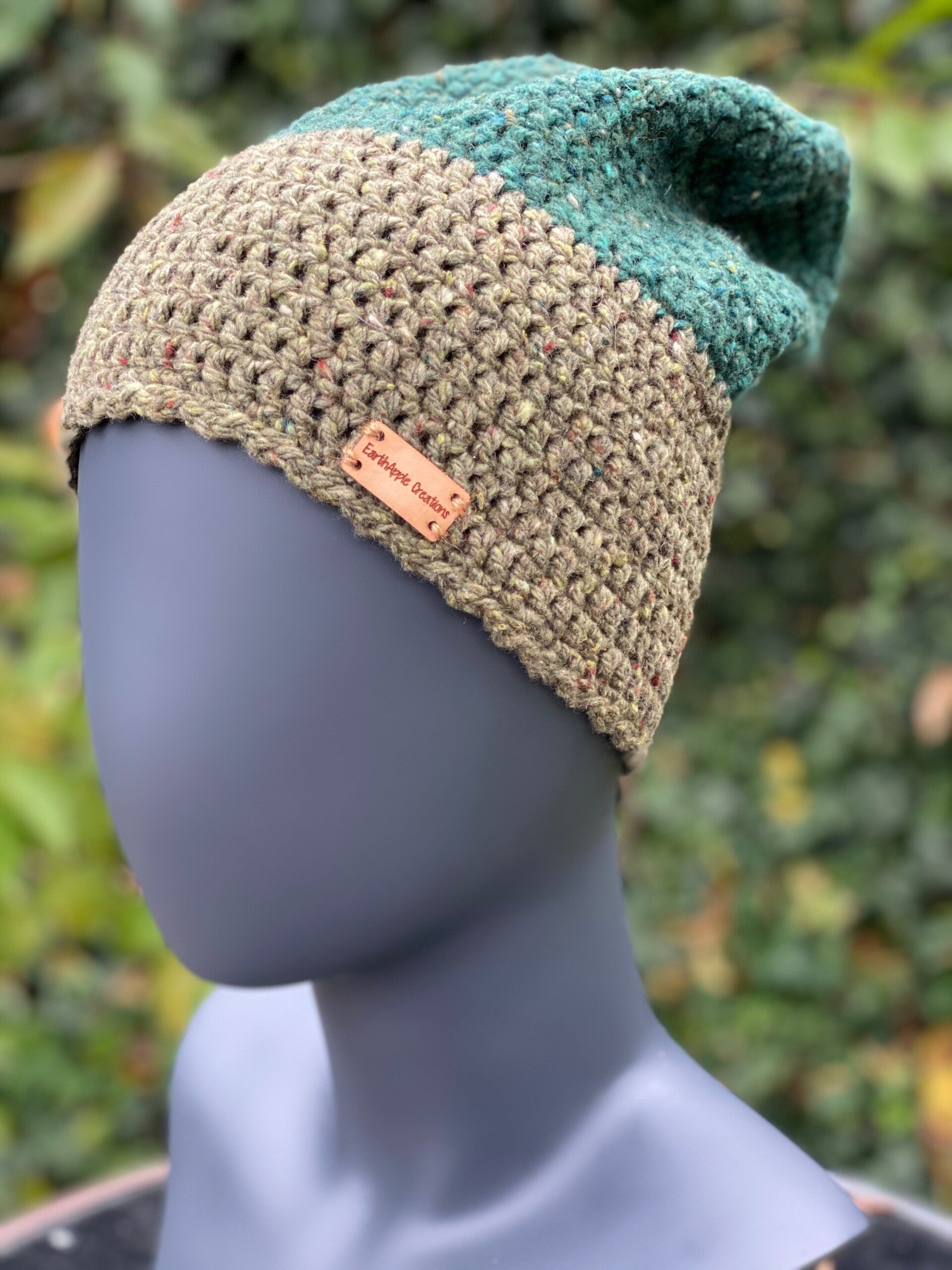 En super beanie in een heel prettig materiaal, 'cool wool': door de viscose in de wol is de beanie niet heel warm maar wel heel stijlvol. Deze is bosgroen en olijf groen, beide met tweed effect - kleine nopjes in andere kleuren.