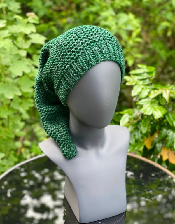 Wonderfully long, pointy beanie, shaped like the hats worn by Link in Zelda, and by the Danish "nisser": The little men and women who used to tease farmers, and who later, after the invention of Santa Claus, decided to help him. A whimsical beanie all in all.