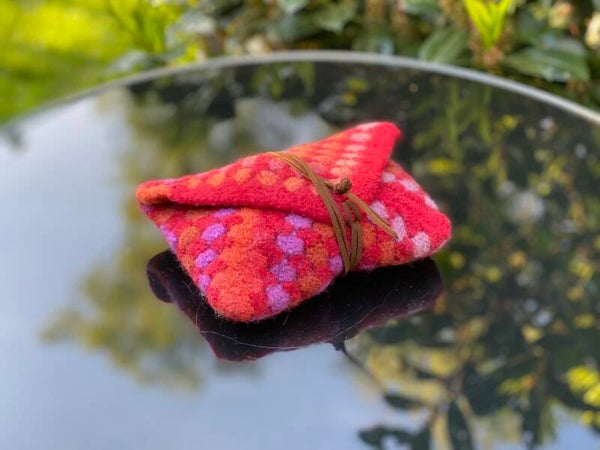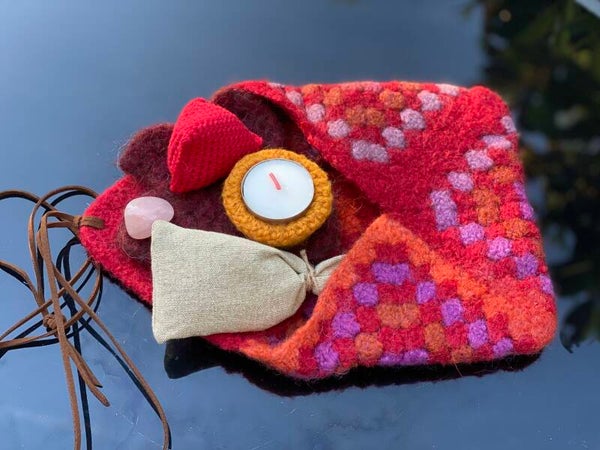 Het tasje zit vol met troost-dingen voor de zintuigen, net als het tasje ook handgemaakt of met zorg geselecteerd. Het tasje is gehaakt van zuivere wol en erna gevilt. Hij sluit met een koord eromheen.