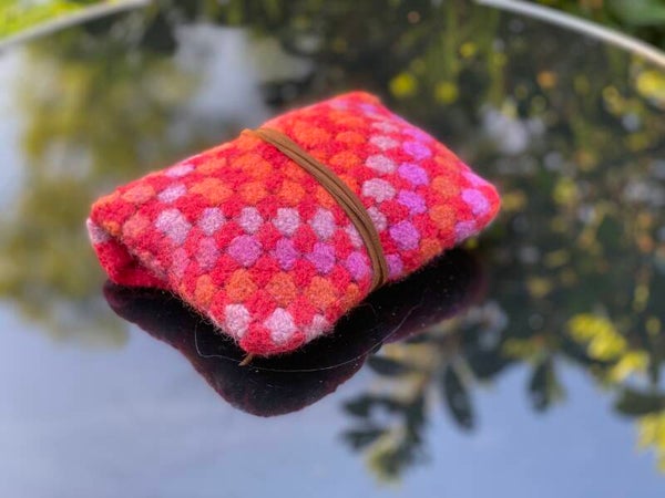 The bag is filled with comforting things for the senses, which have been handcrafted and carefully selected, just like the bag. The bag is crocheted from pure wool and has been felted afterwards. It closes with a cord.