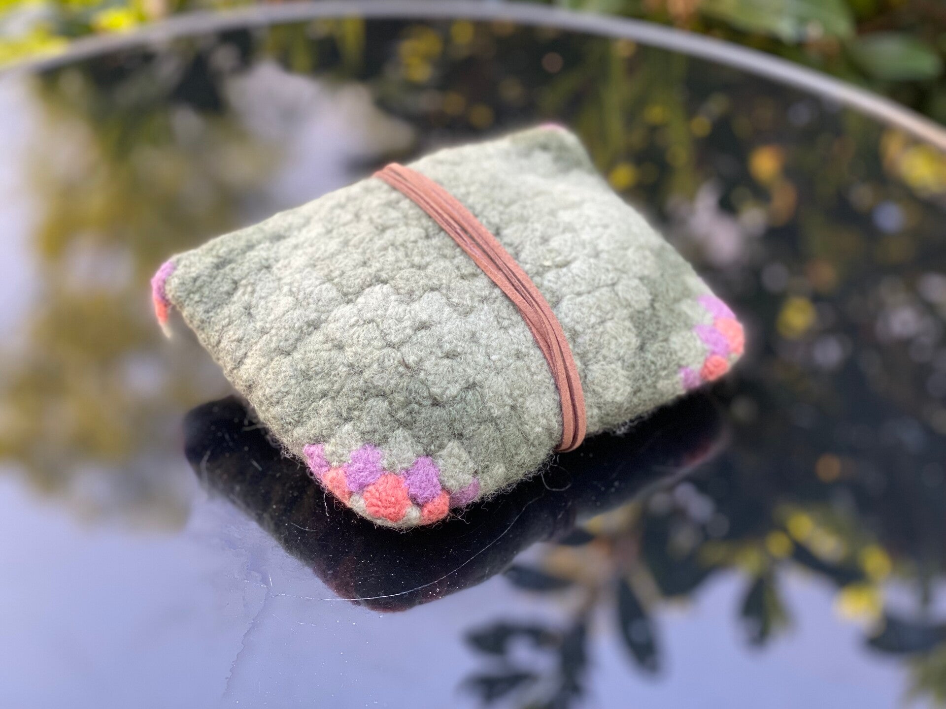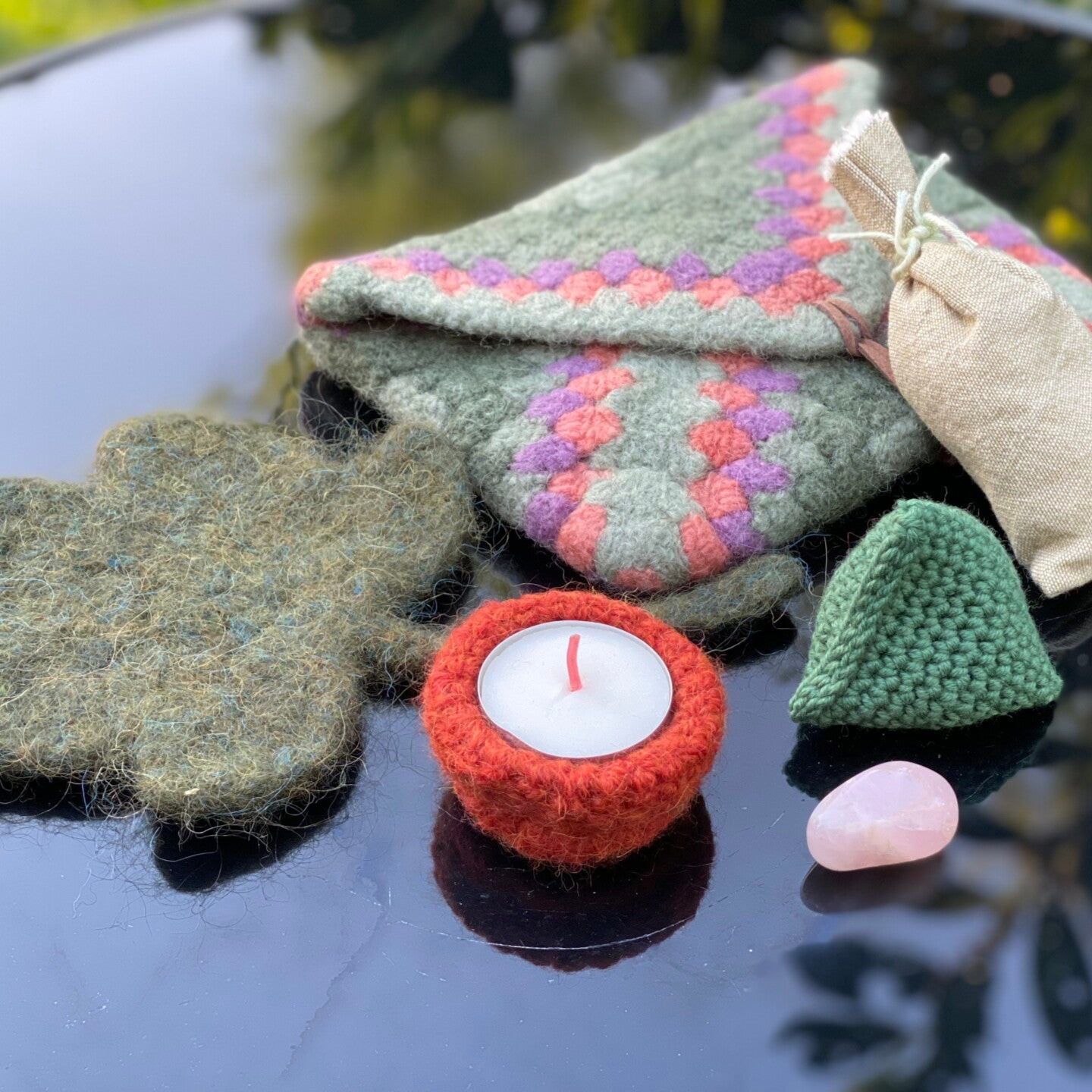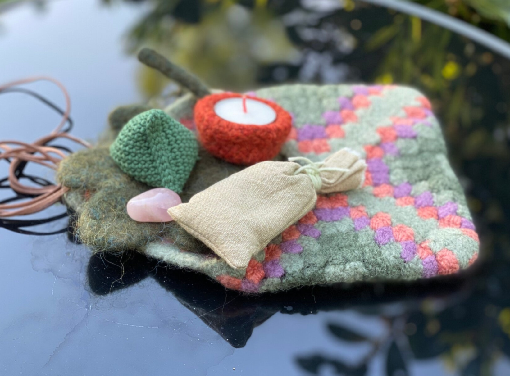 Het tasje zit vol met troost-dingen voor de zintuigen, net als het tasje ook handgemaakt of met zorg geselecteerd. Het tasje is gehaakt van zuivere wol en erna gevilt. Hij sluit met een koord eromheen.