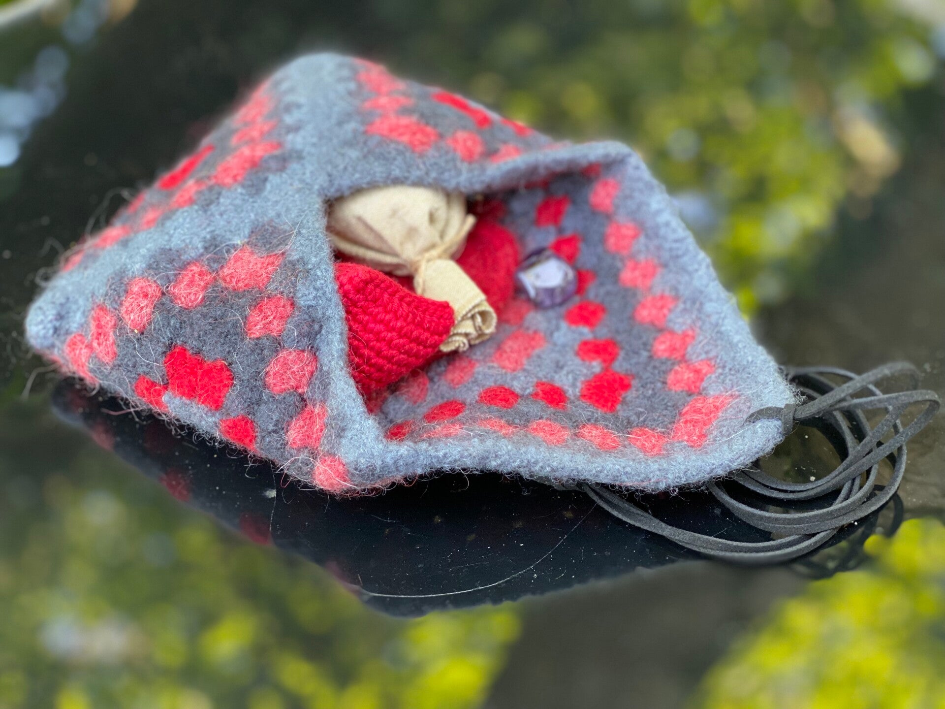 Het tasje zit vol met troost-dingen voor de zintuigen, net als het tasje ook handgemaakt of met zorg geselecteerd. Het tasje is gehaakt van zuivere wol en erna gevilt. Hij sluit met een koord eromheen.