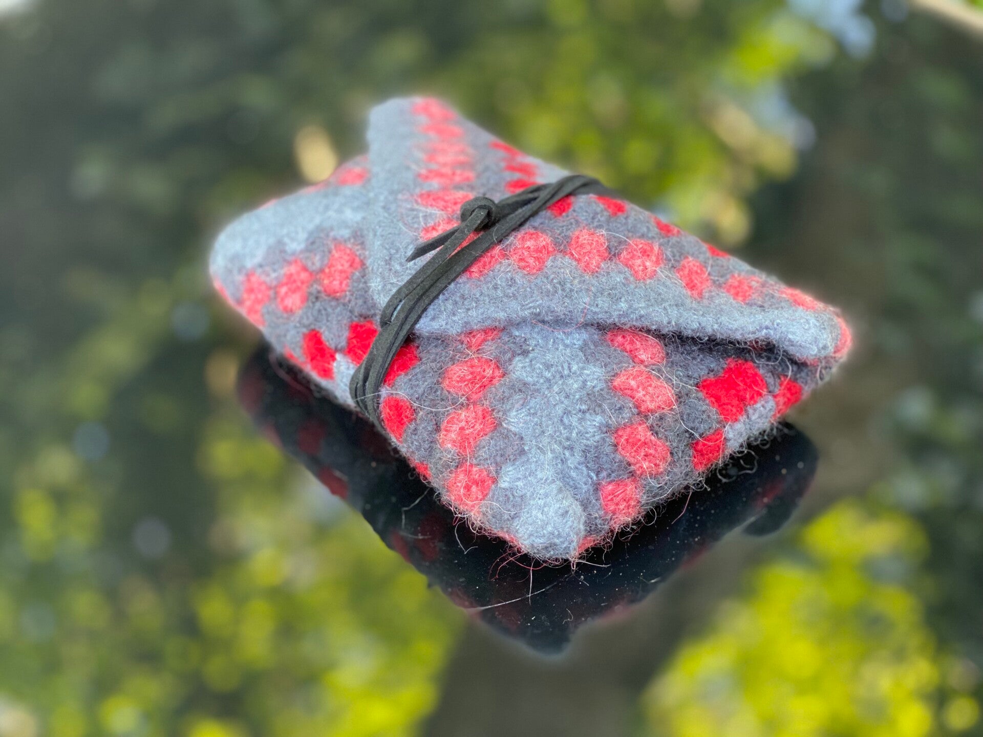 The bag is filled with comforting things for the senses, which have been handcrafted and carefully selected, just like the bag. The bag is crocheted from pure wool and has been felted afterwards. It closes with a cord.