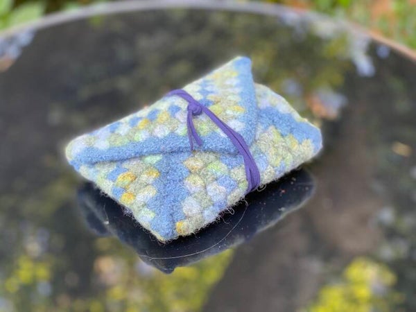 The bag is filled with comforting things for the senses, which have been handcrafted and carefully selected, just like the bag. The bag is crocheted from pure wool and has been felted afterwards. It closes with a cord.