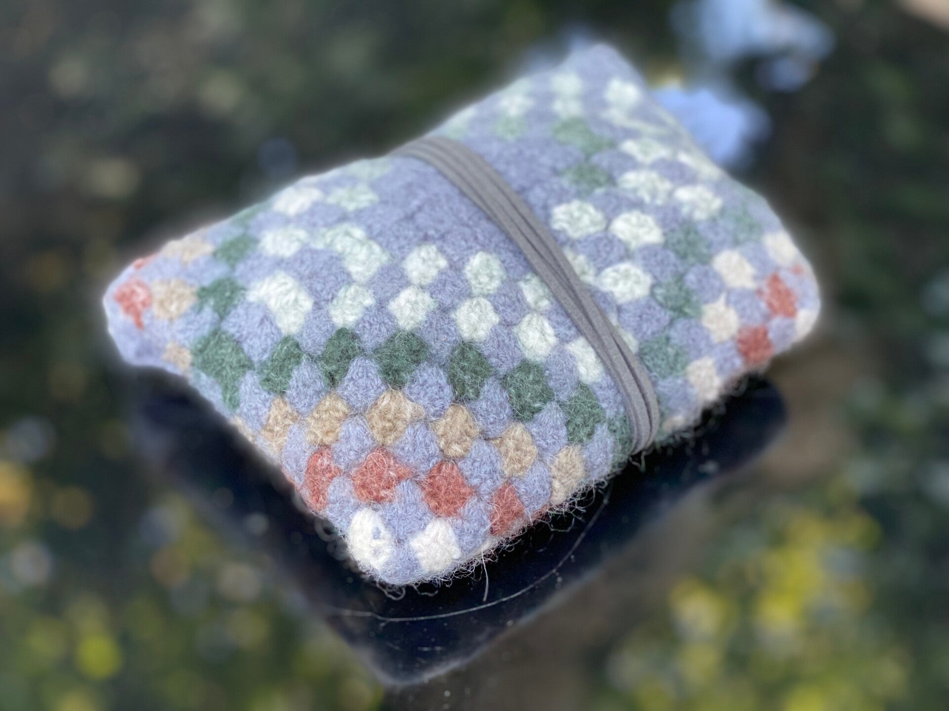 The bag is filled with comforting things for the senses, which have been handcrafted and carefully selected, just like the bag. The bag is crocheted from pure wool and has been felted afterwards. It closes with a cord.
