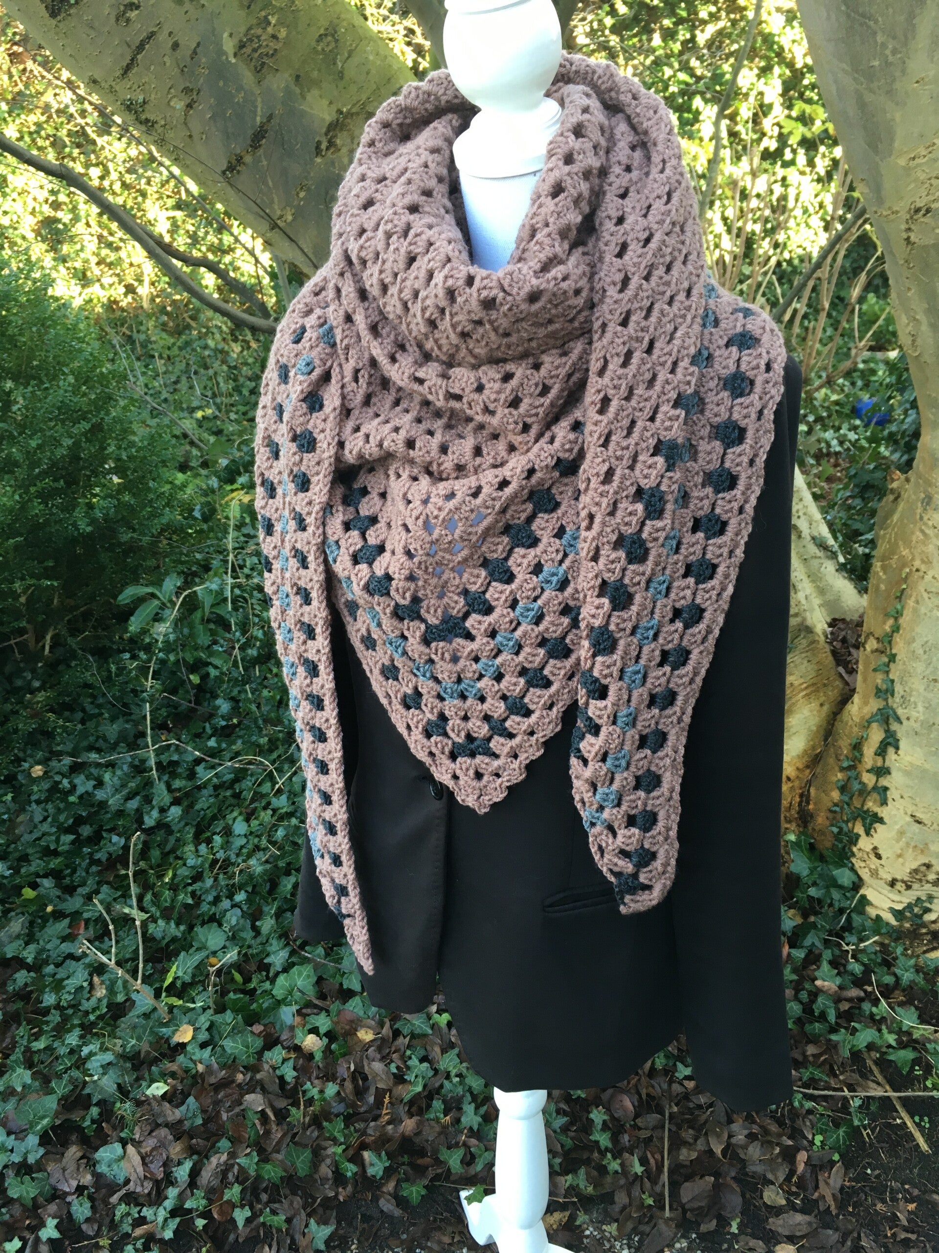 Triangular, medium sized wrap/shawl, extremely soft. The Hugs are our nice, warm shawl of "normal" size. We call them Hugs because they feel like a hug - soft and friendly to wear. The yarns used for this Hug makes it extremely light weight, incredibly nice to wear. You can use it as a wrap, but also as a scarf around your neck, with the point in front. It's really easy to shape and has extra long ‘wings’ so the knot will stay in place.