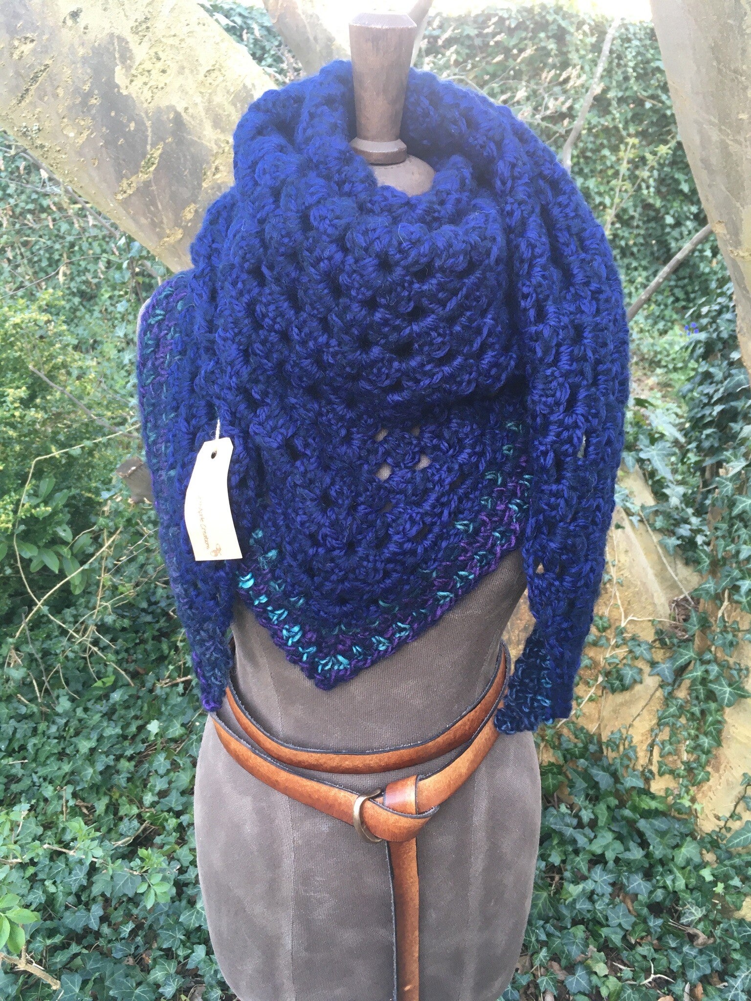 Triangular, medium sized wrap/shawl, extremely soft. The Hugs are our nice, warm shawls of "normal" size. We call them Hugs because they feel like a hug - soft and friendly to wear. Having used two threads, it is a deep blue with touches of turquoise and purple edge, make it unnique. You can use it as a wrap, but also as a scarf around your neck, with the point in front. It's really easy to shape and has extra long ‘wings’ so the knot will stay in place.