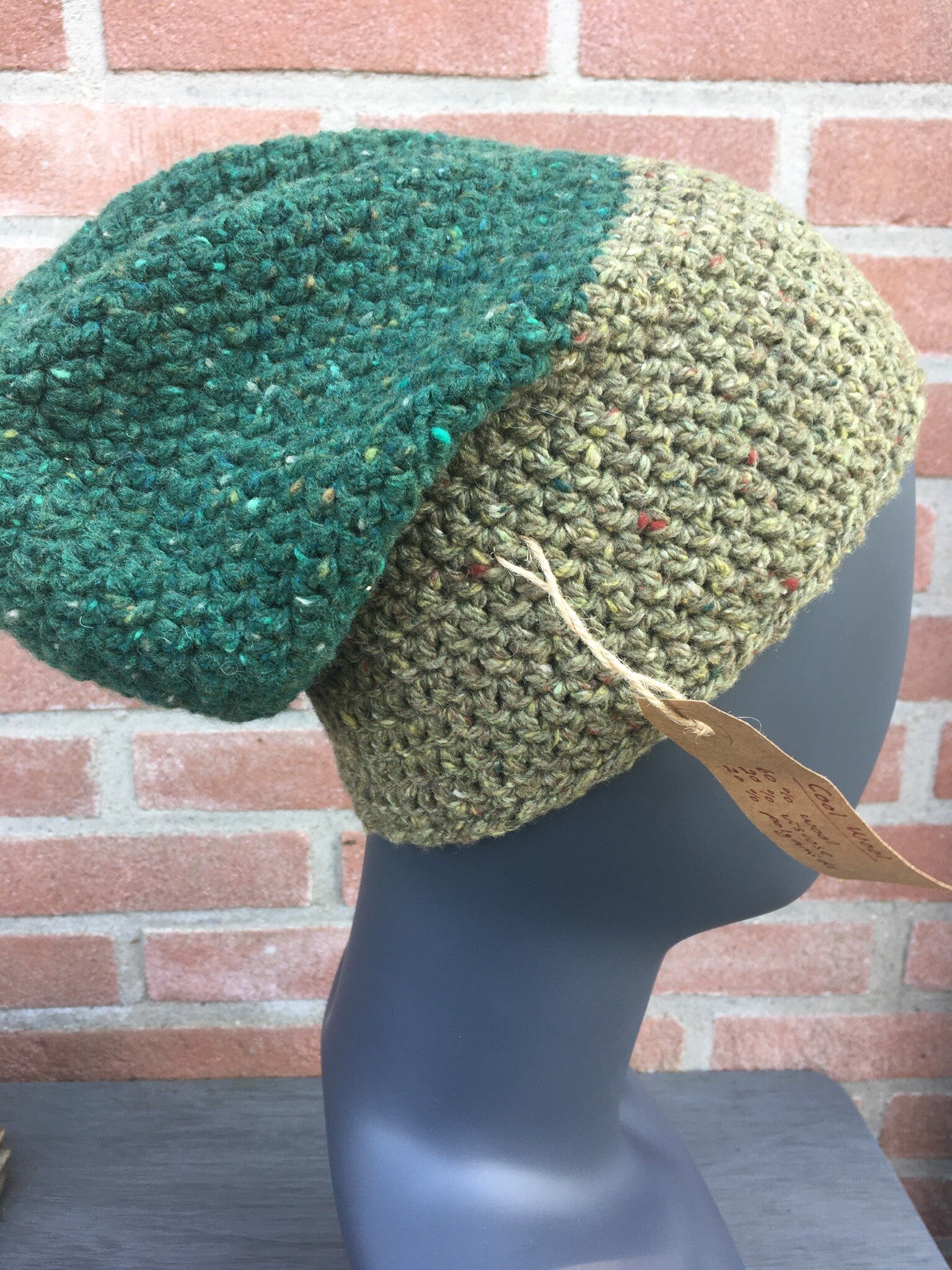 An awesome beanie made in a very comfortable yarn, 'cool wool': The viscose in the yarn makes the beanie comfortable and not too warm, and very stylish. This one is green and olive green, both colours with a tweed effect - little speckles in different colours.