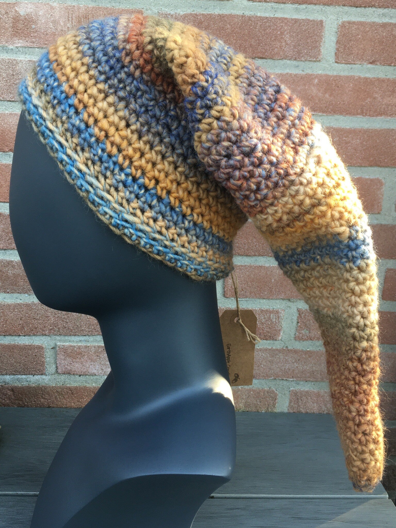 Wonderfully long, pointy beanie, shaped like the hats worn by the Danish "nisser": The little men and women who used to tease farmers, and who later, after the invention of Santa Claus, decided to help him. A whimsical beanie all in all.