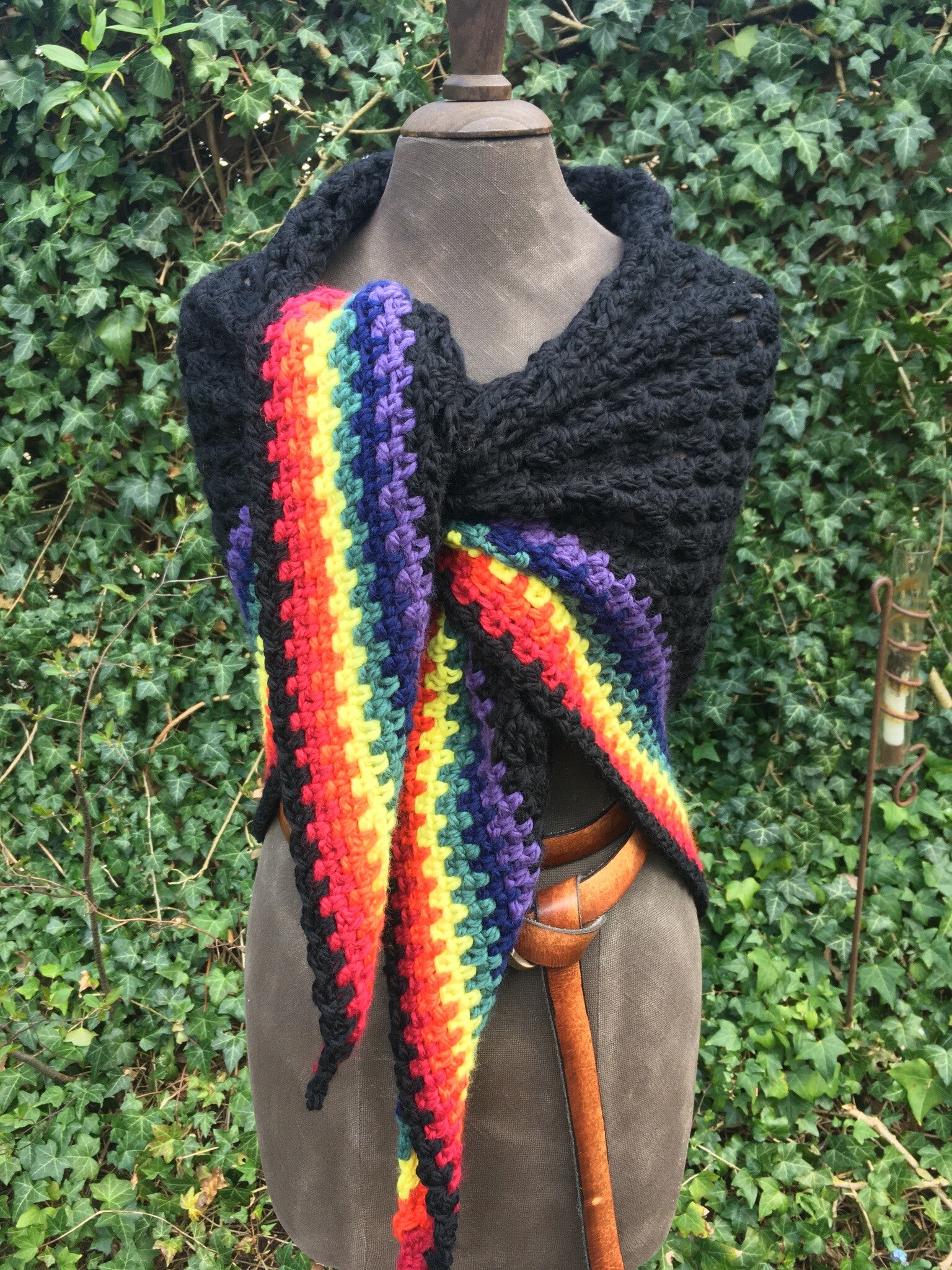 Driehoekige, middelgrote omslagdoek / sjaal - heel zacht zonder pluizerig te zijn. Zacht met een mooie, sprekende regenboog-rand.