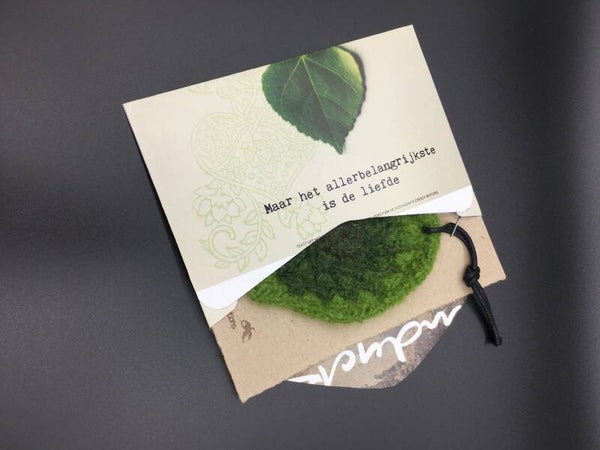 • Materials: Tag - handmade from 100% wool, felted. Card - made of recycled cardboard. Envelope - made of up-cycled magazines.