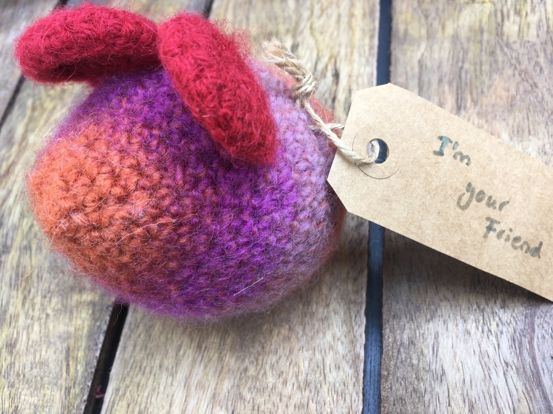 They have been crocheted from 100% wool and are filled with washable polyester stuffing, after which they have been felted in the washer. Thus, the Friends can be laundered, and are close and safe, without any loose parts.