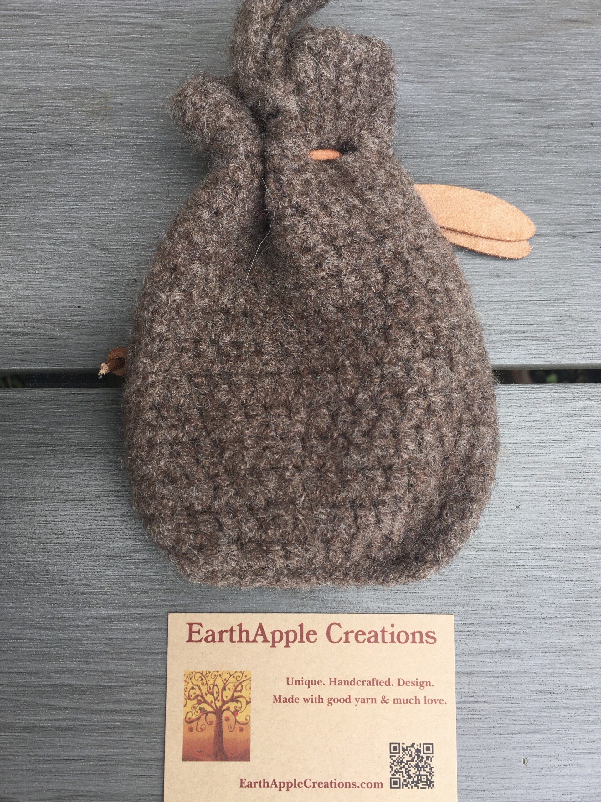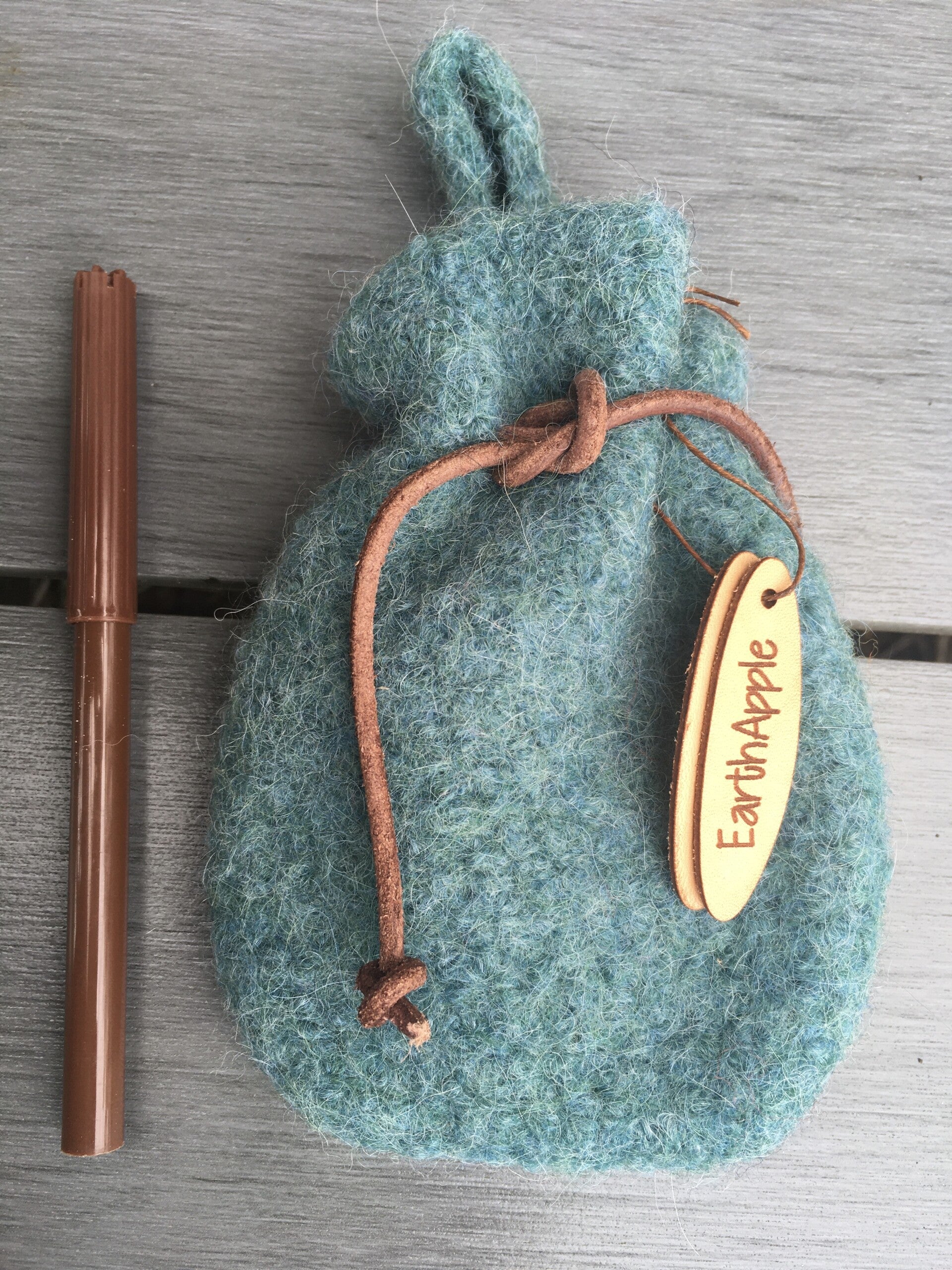 - Materials: Crocheted from 100% wool, then felted. Cord = leather.