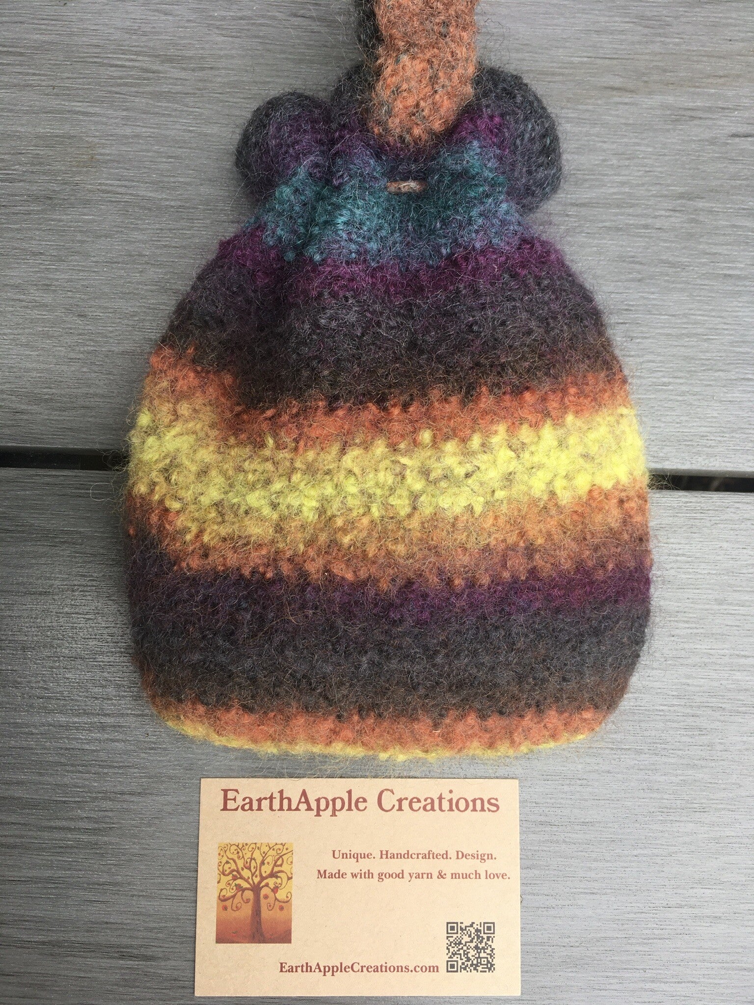 - Materials: Crocheted from 100% wool, then felted. Cord = leather.