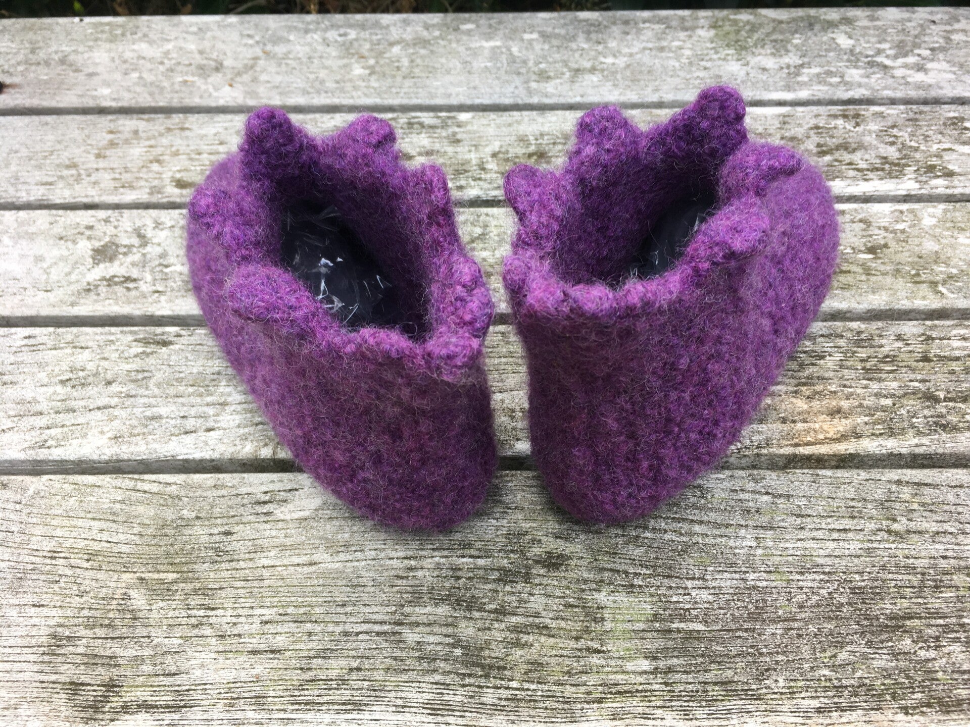 Crocheted from 100% wool, then felted, and dried on a model in the right size. This has made them very thick and warm, but also breathable.