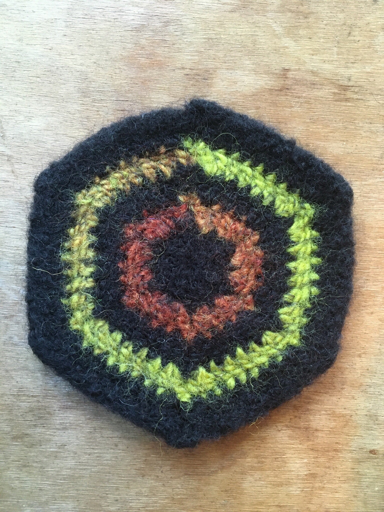 All coasters are made from 100% wool; they were crocheted first, then felted. Wool is super insulating when treated in this manner.