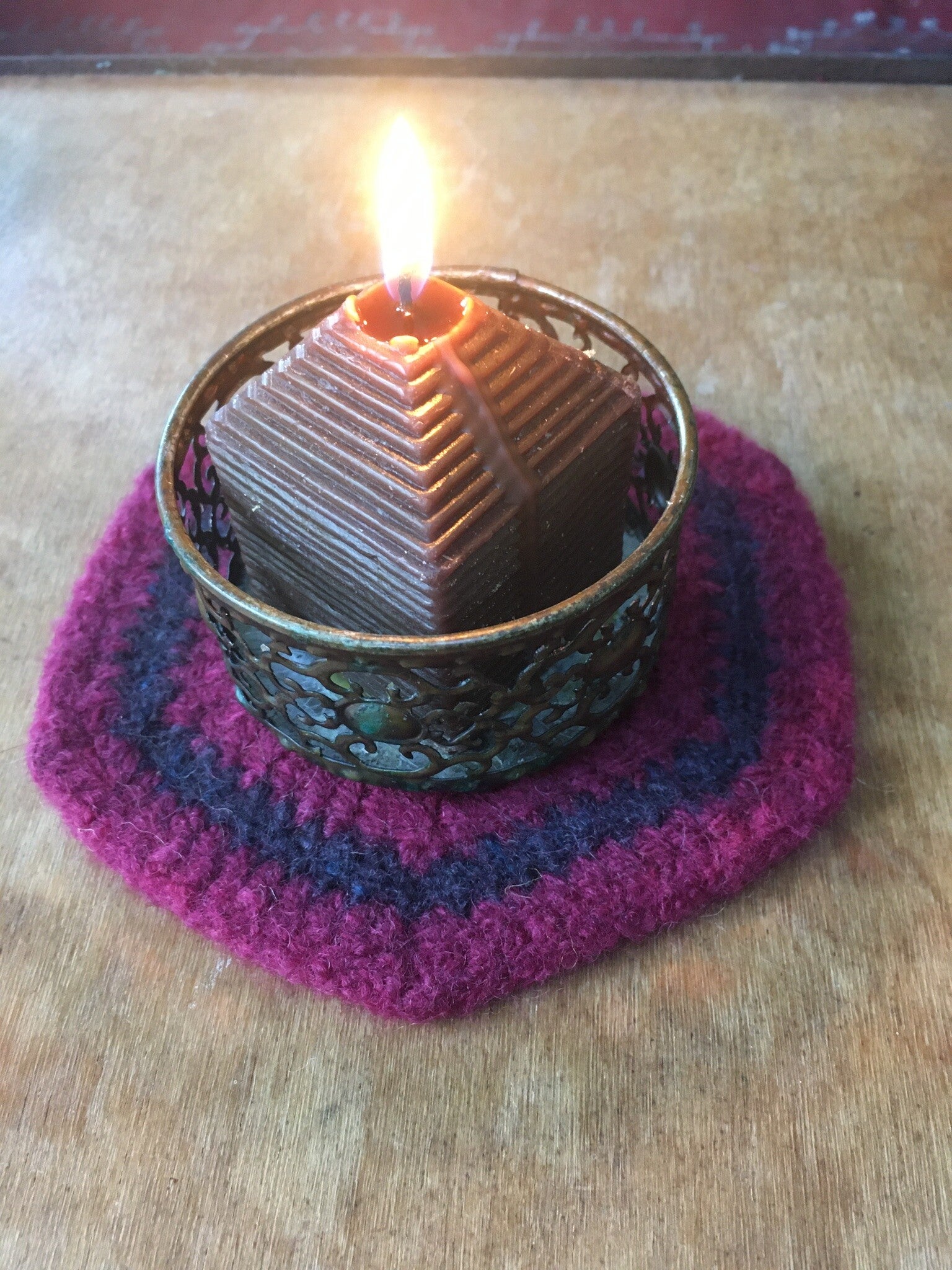All coasters are made from 100% wool; they were crocheted first, then felted. Wool is super insulating when treated in this manner.