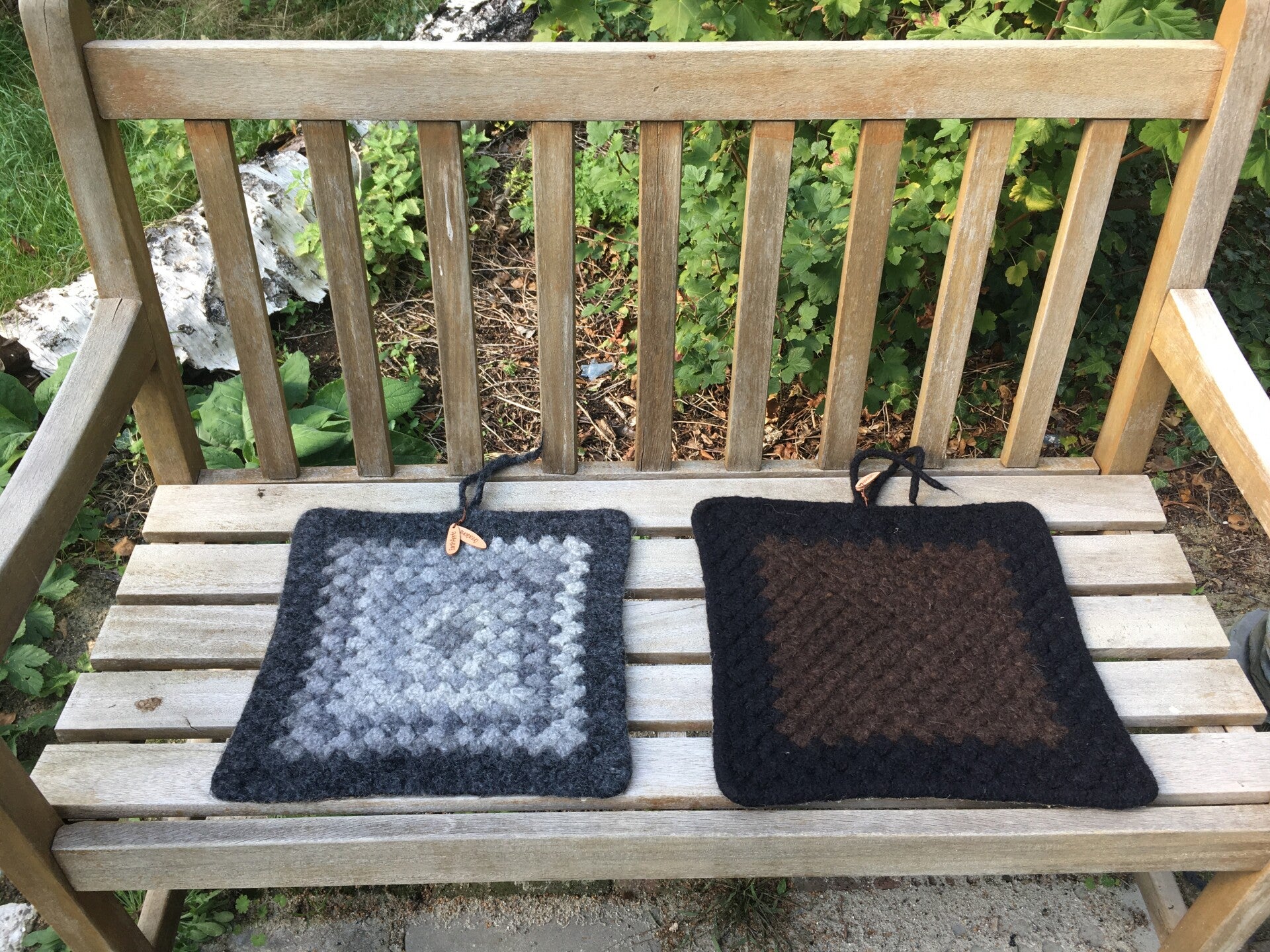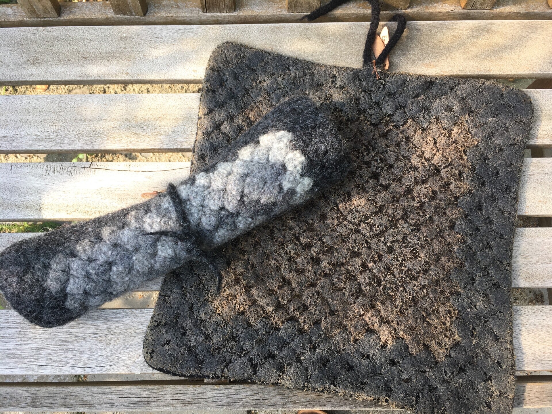 In essence, this mat is a very large granny square with reinforced edges and corners, and has been felted after crocheting. The result is a very pretty and very practical mat for just about all situations outside. The mat has a layer of natural rubber on the back so it is protected against damp grass.