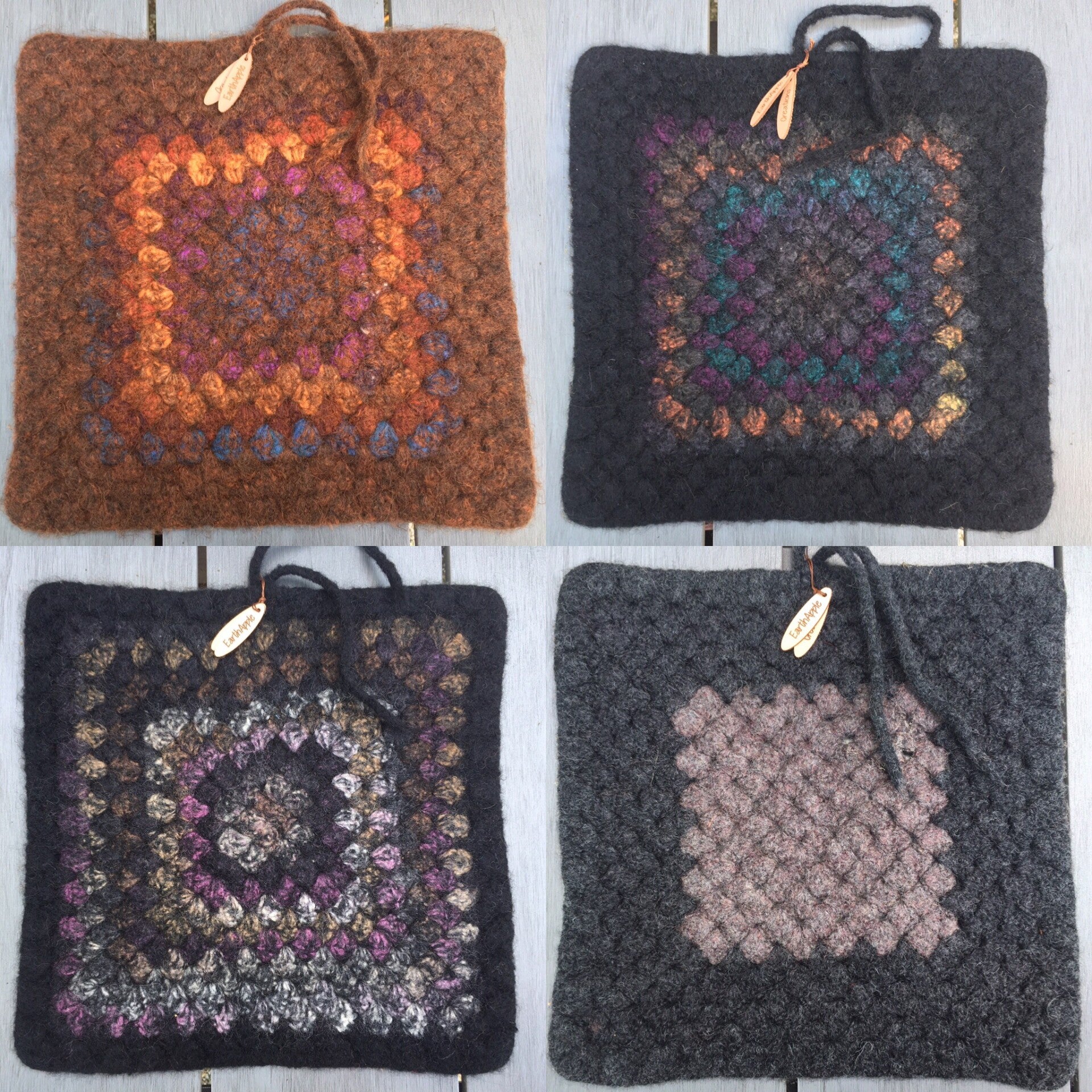 In essence, this mat is a very large granny square with reinforced edges and corners, and has been felted after crocheting. The result is a very pretty and very practical mat for just about all situations outside. The mat has a layer of natural rubber on the back so it is protected against damp grass.