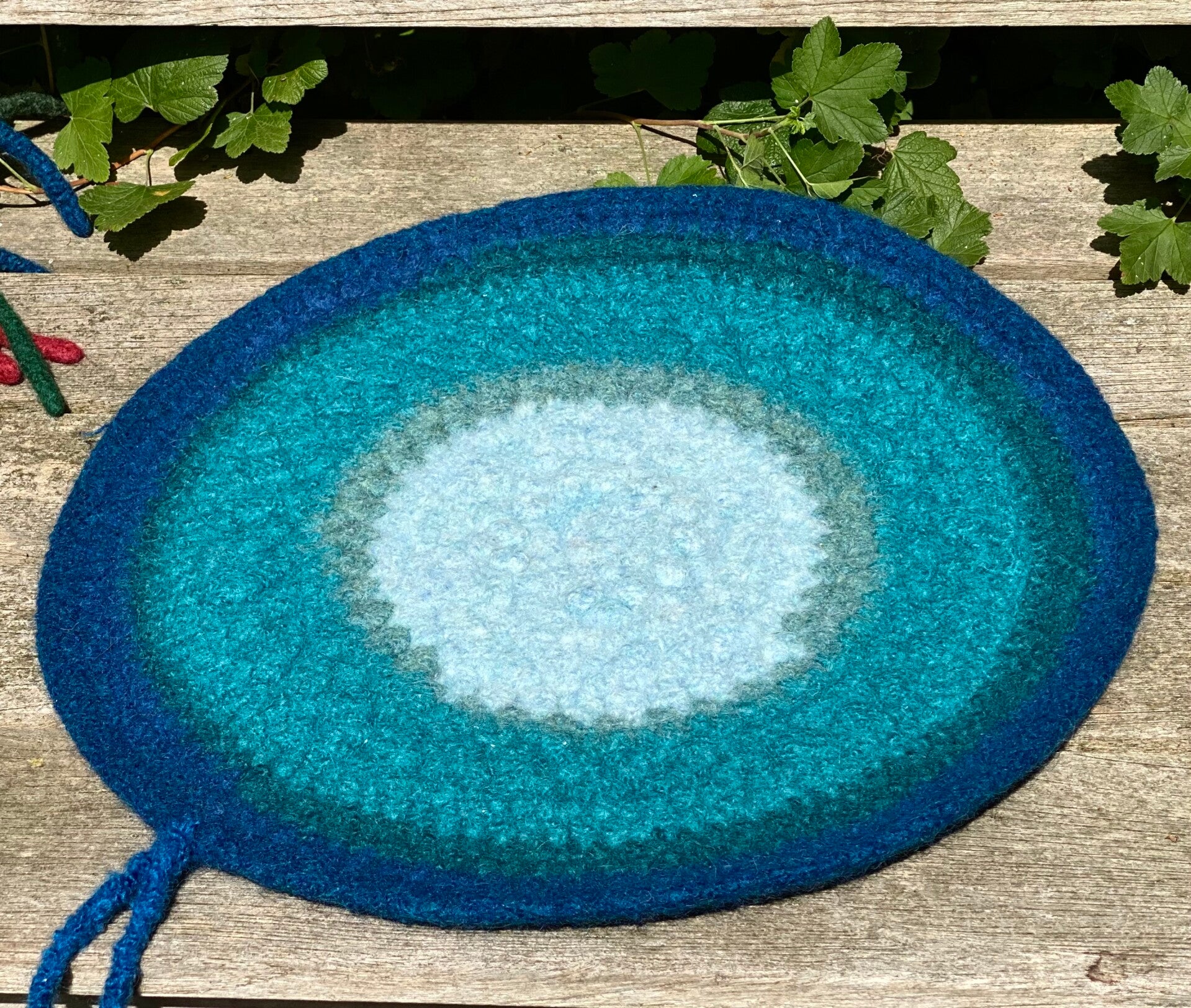 A pretty, but also very practical mat, suitable for just about all outdoor situations: the woolen mat is crocheted and felted afterwards, making it very insulating against cold from the below. It is easy to roll up and to bind it with the straps, making it fit in the side-pocket of a backpack. It is excellent for festivals, hiking, or simply for the bench in your back garden - your outdoor season just gets prolonged.