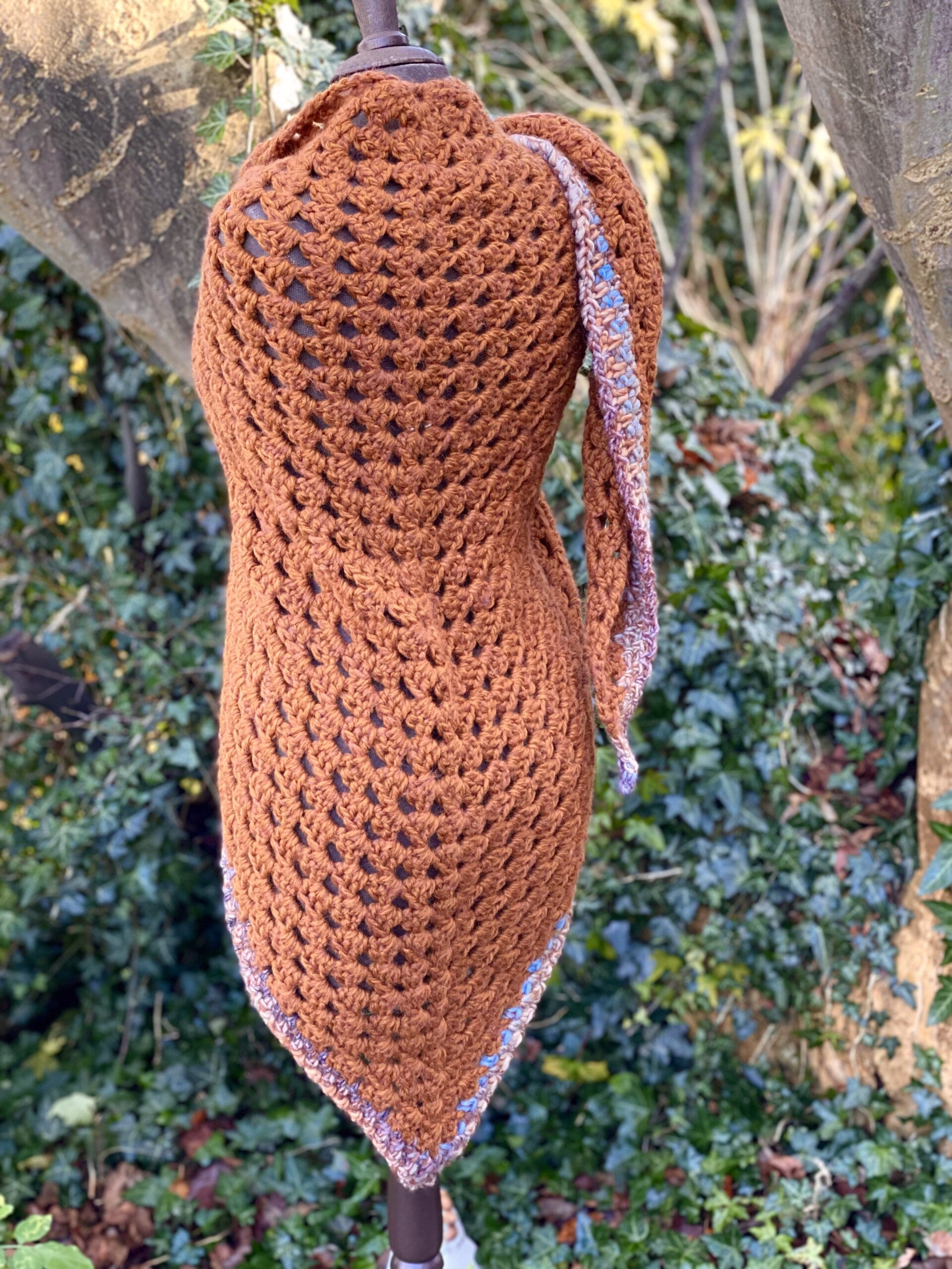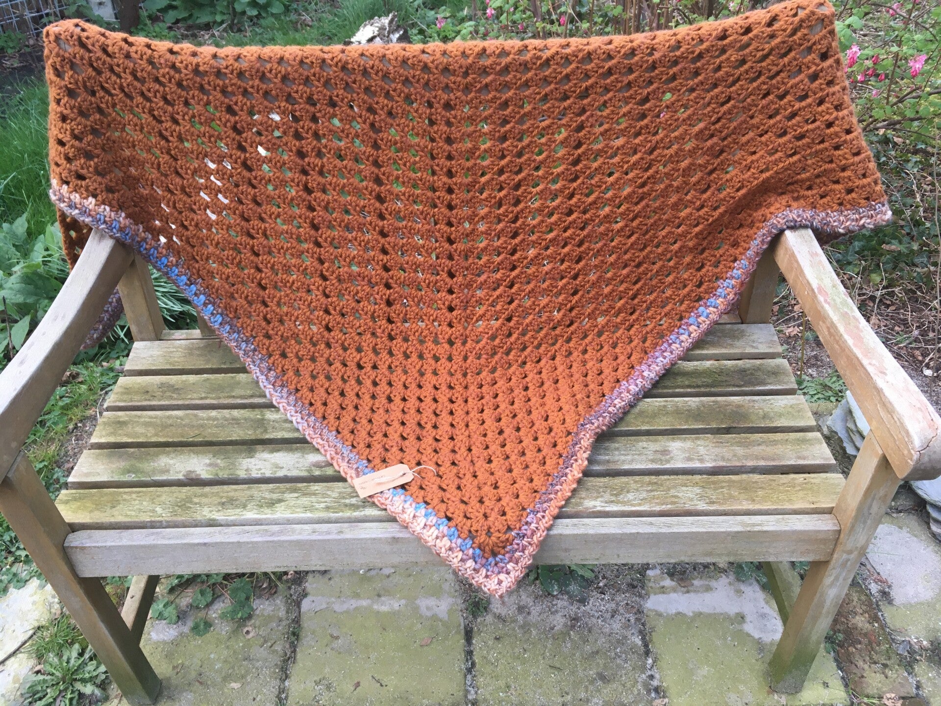 Karamel-kleurige Big Hug omslagdoek met een rand in natuur en lichtblauwe nuances