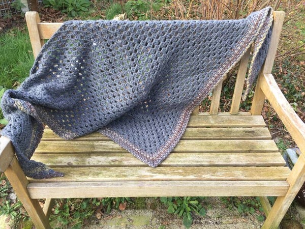 Driehoekige, supergrote omslagdoek, extreem zacht door de combinatie van drie verschillende draden. Hij is effen grijs met een rand met natuur-bruine kleuren - aarde, zand. Ondanks de grootte van de doek voelt hij in het geheel niet zwaar aan, hij draagt juist heel prettig - als een knuffel.