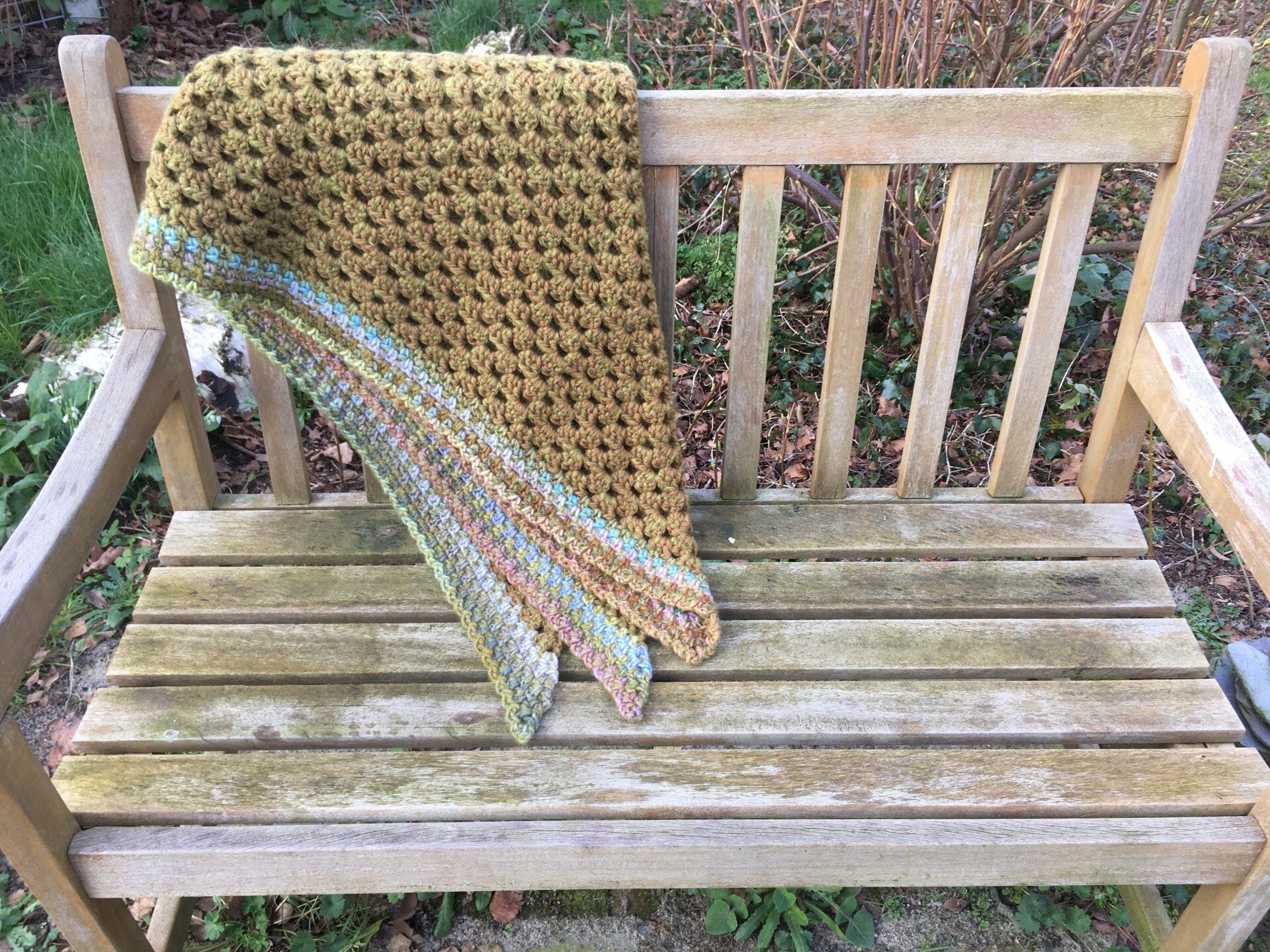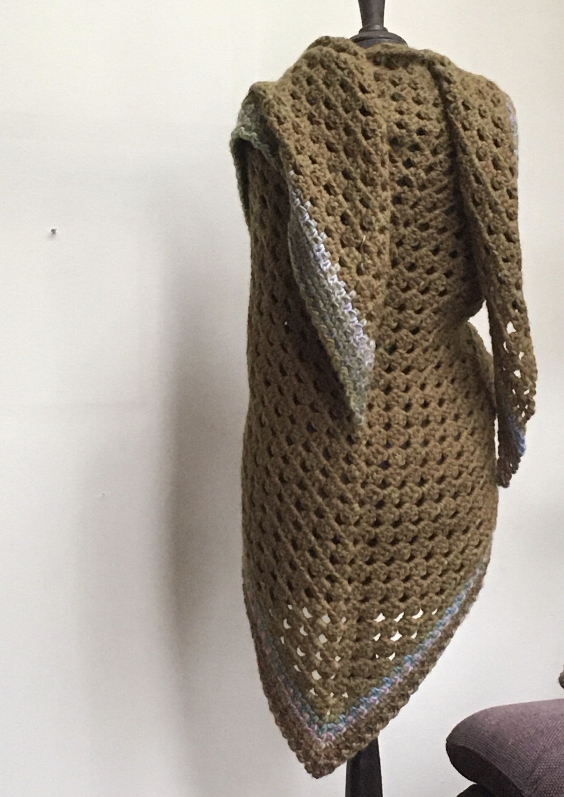 Driehoekige, supergrote omslagdoek, extreem zacht door de combinatie van drie verschillende draden. Hij is effen olijfgroen met een rand in pastel-kleuren. Ondanks de grootte van de doek voelt hij in het geheel niet zwaar aan, maar gewoon warm en prettig - echt een knuffel.