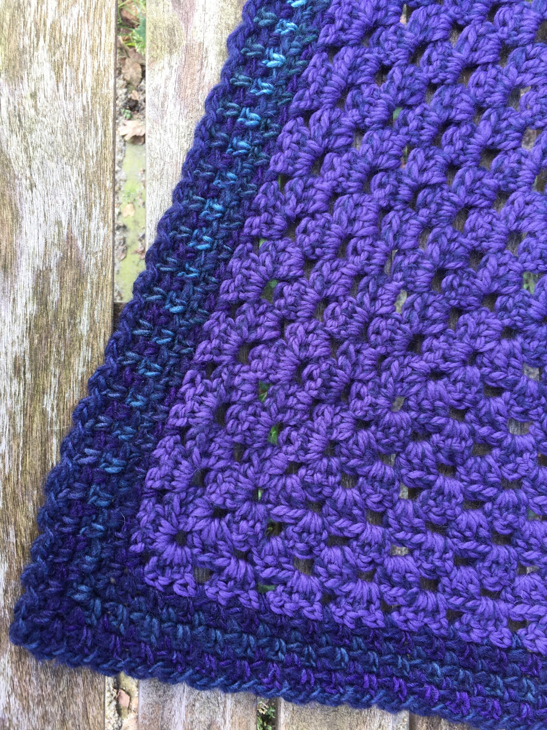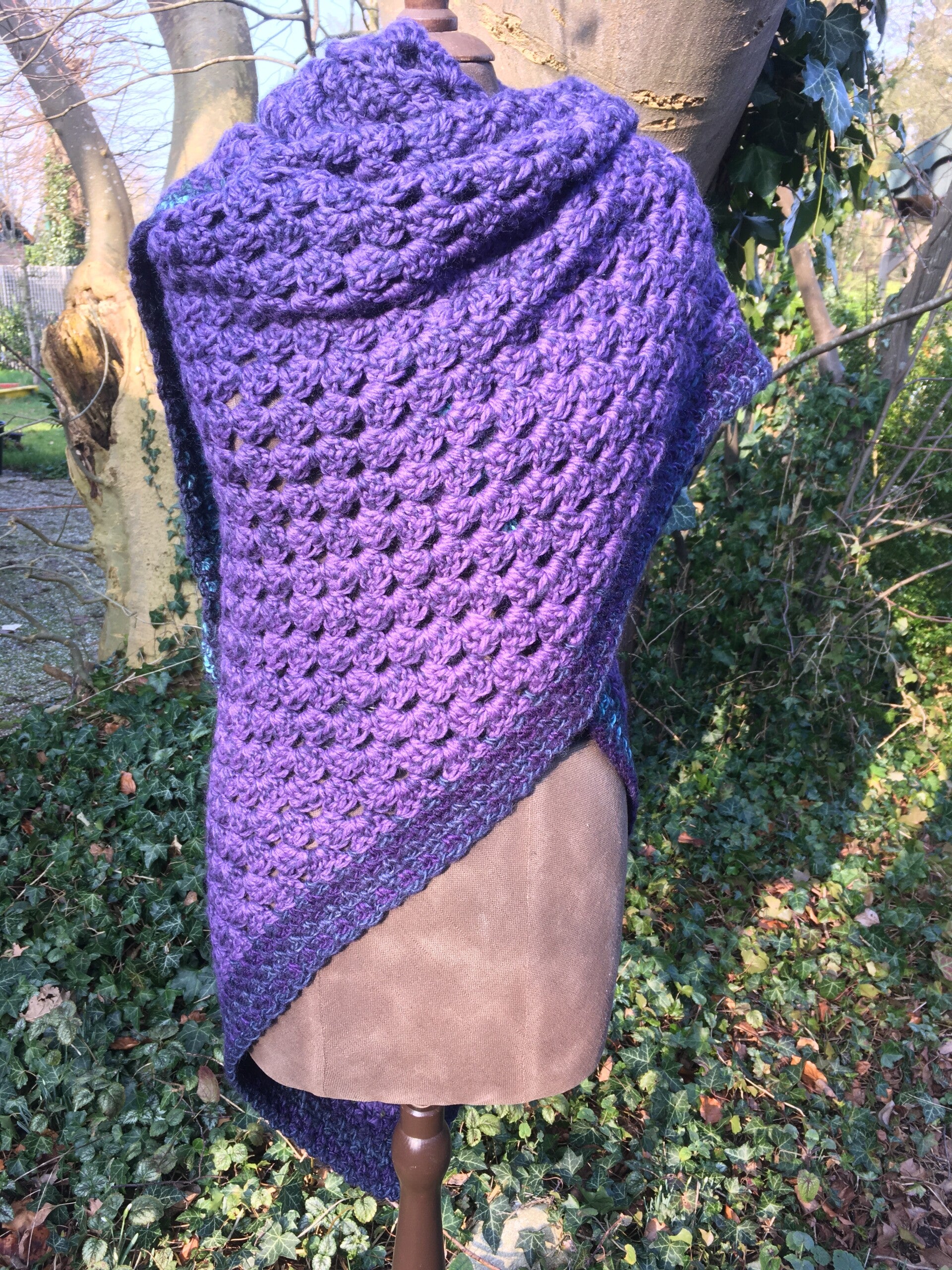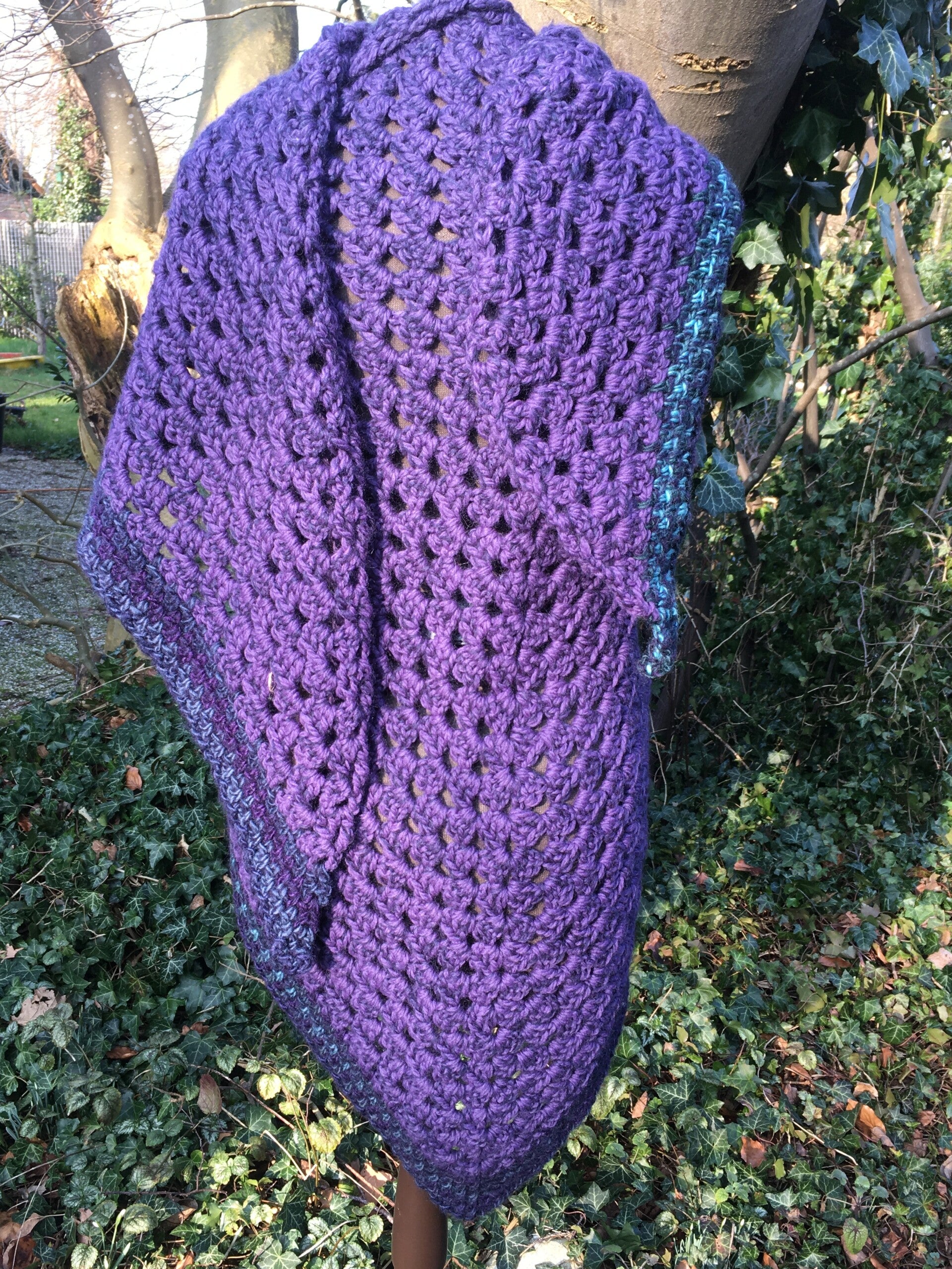 Driehoekige, supergrote omslagdoek, extreem zacht door de combinatie van drie verschillende draden. Hij is echt paars, met een mooie rand in donkerblauwe en turquoise kleuren. Ondanks de grootte van de doek voelt hij in het geheel niet zwaar aan, maar gewoon warm en prettig - echt een knuffel.
