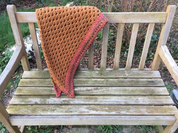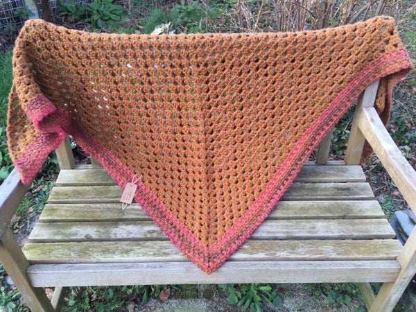 Driehoekige, supergrote omslagdoek, extreem zacht door de combinatie van drie verschillende garens. Hij is gehaakt in een warme karamel kleur met een rand bruine en pink kleuren. Ondanks de grootte van de doek voelt hij in het geheel niet zwaar aan, maar super fijn en heerlijk dragen - echt een knuffel.