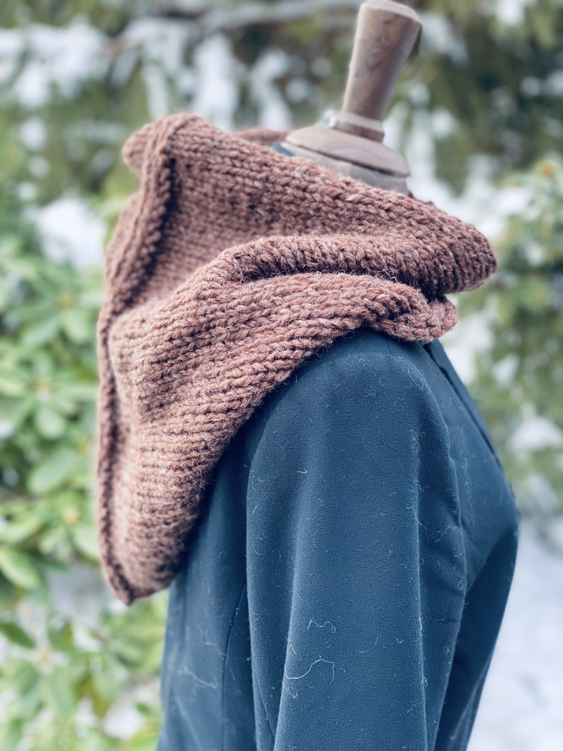 Een heerlijke hood - capuchon - gebreid van 100% wol. Super handig in plaats van een muts, en staat erg leuk! Docht vooraan, dus je trekt hem aan over je hoofd.