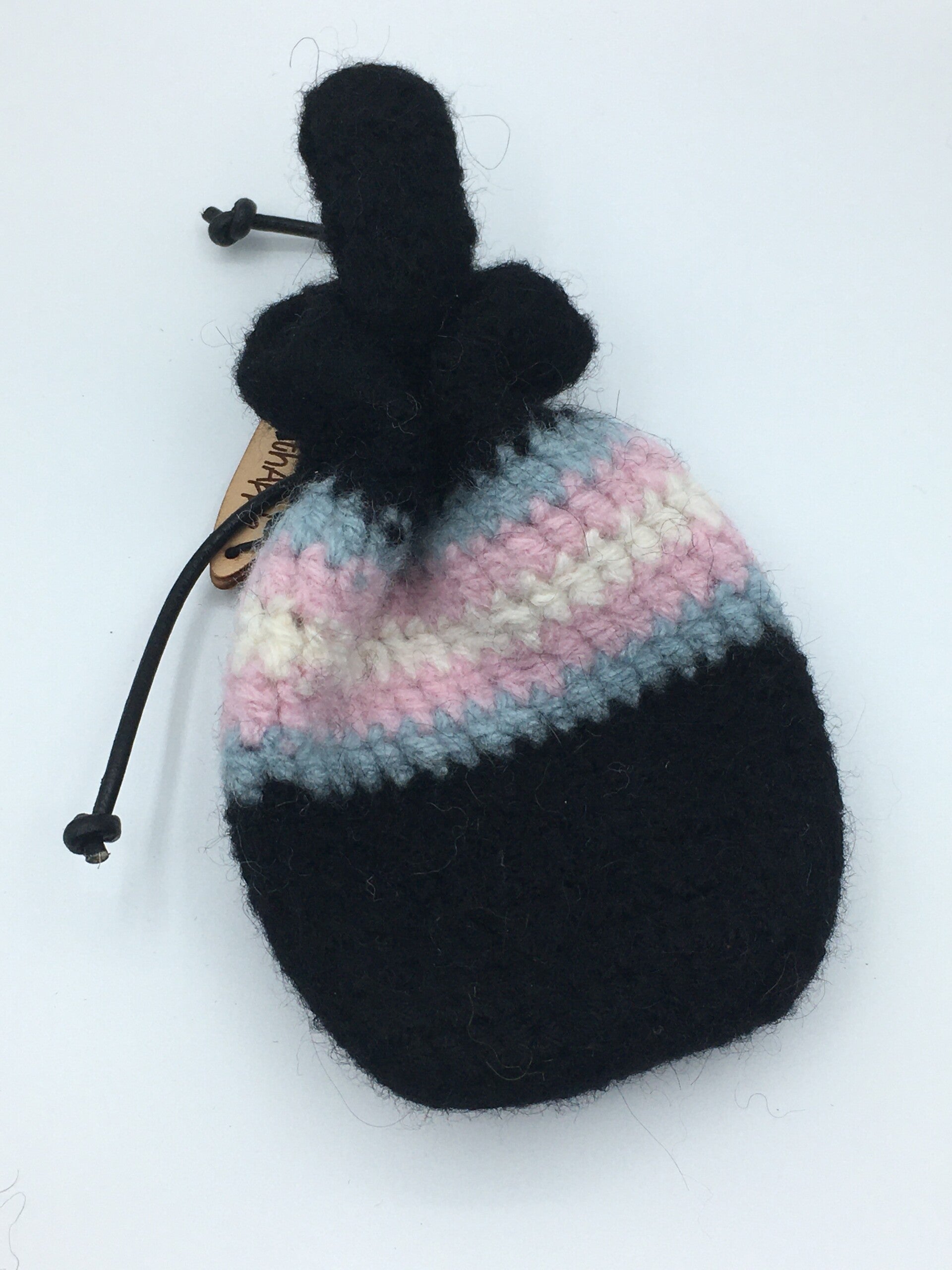 - Materials: Crocheted from 100% wool, then felted. Cord = leather.