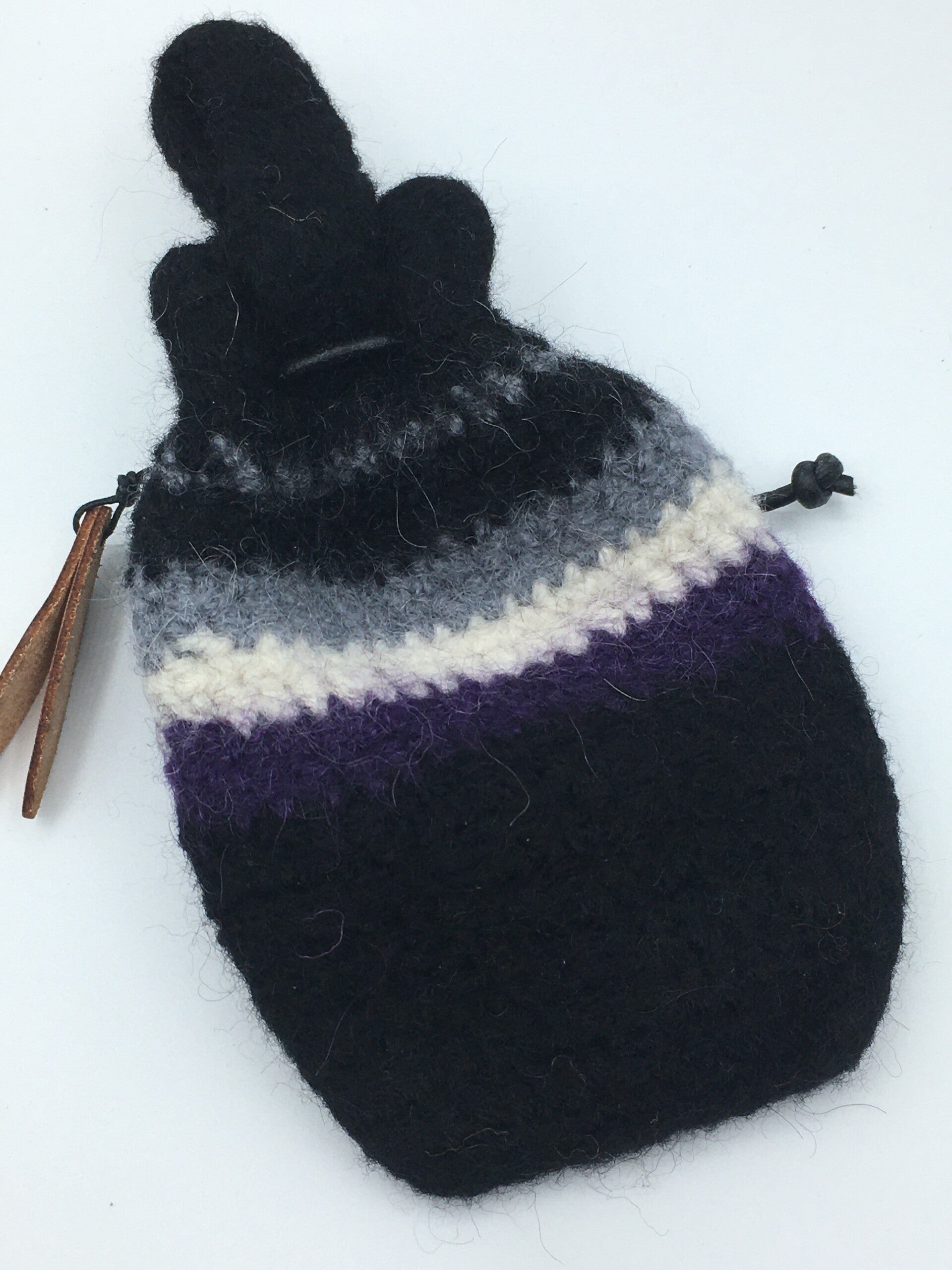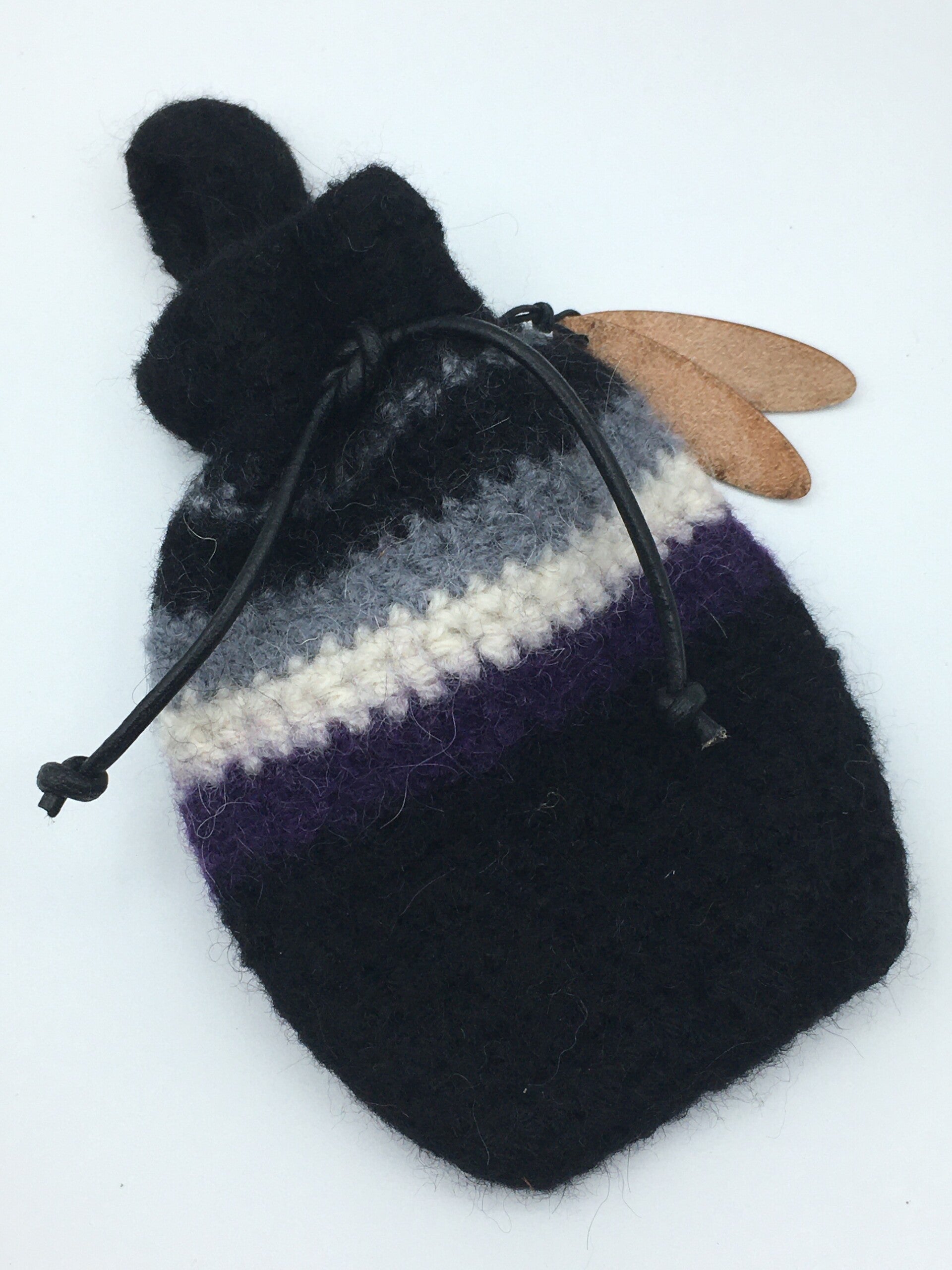 - Materials: Crocheted from 100% wool, then felted. Cord = leather.