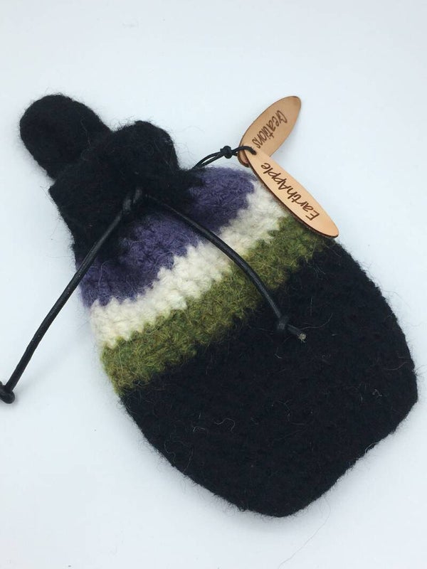 - Materials: Crocheted from 100% wool, then felted. Cord = leather.