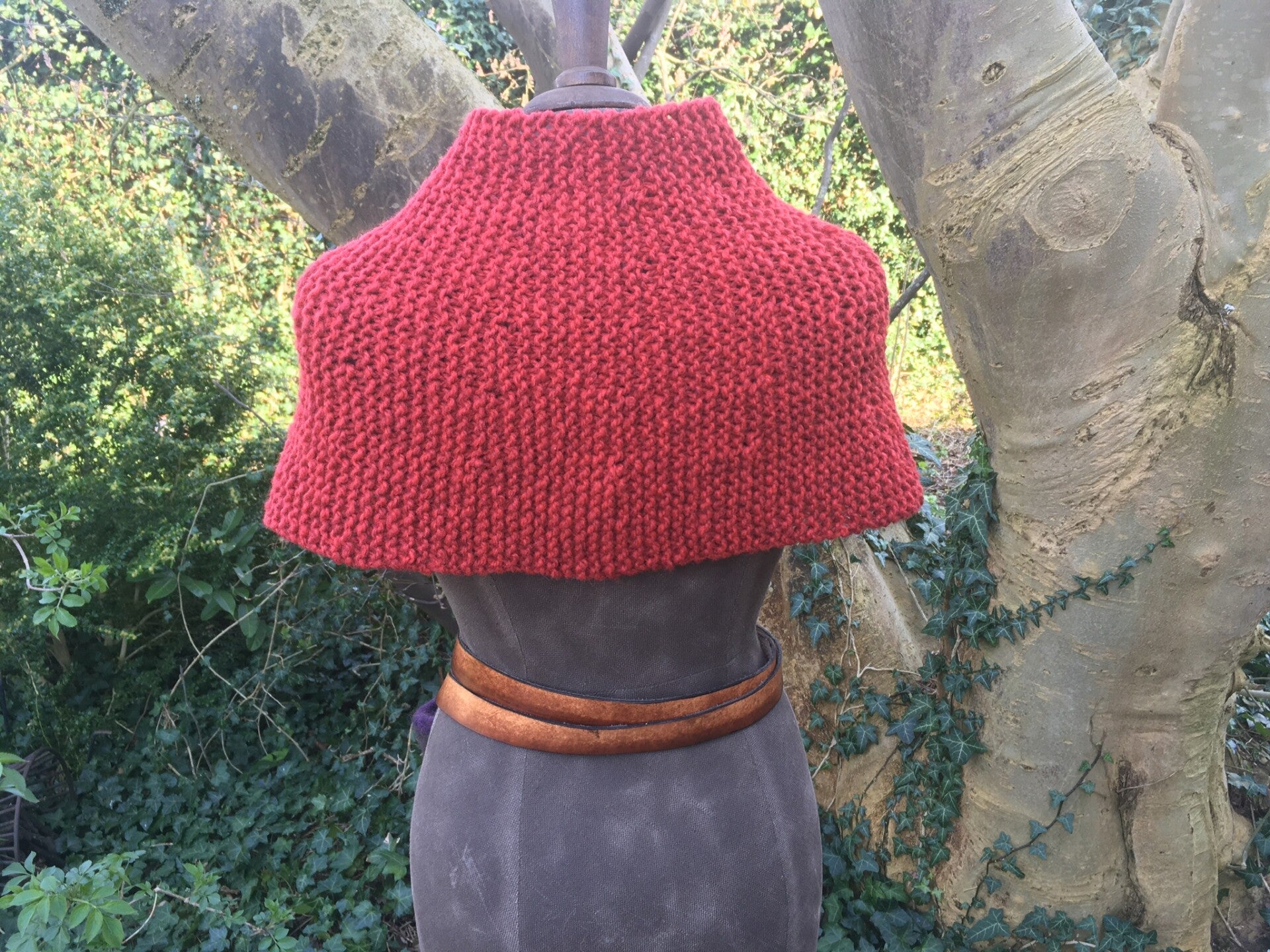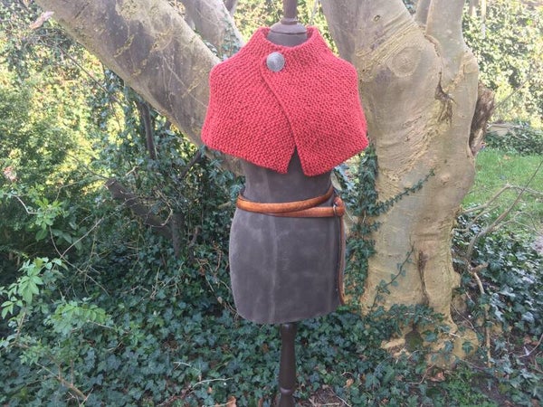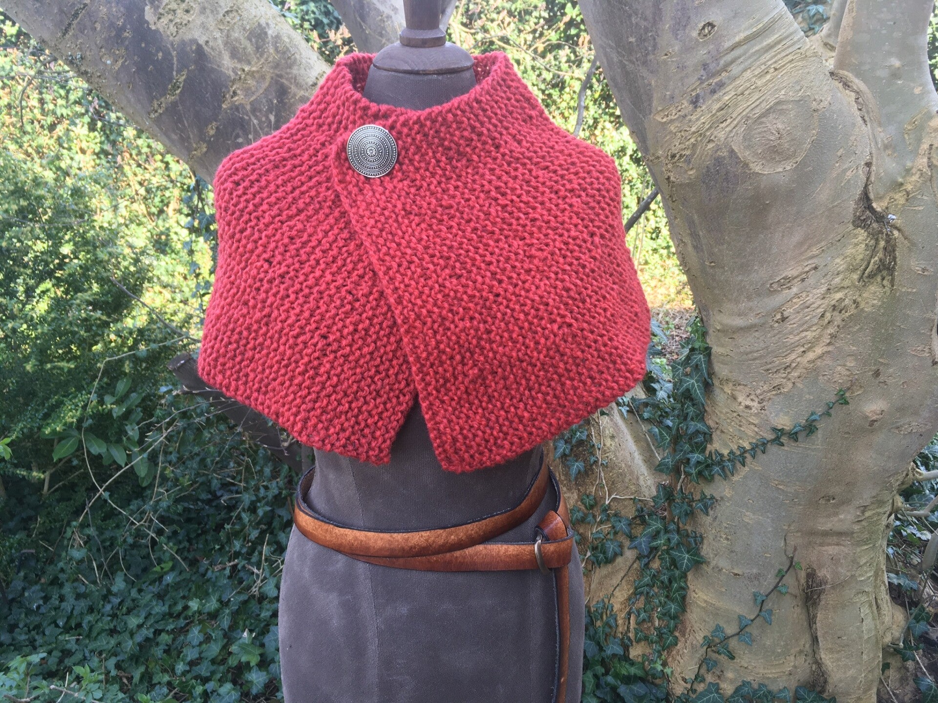 Ronde capelet, sluitend met een broche (krijg je ook mee, kies je kleur broche met het knopje). De capelet gaat net over de schouders en houdt zo je bovenrug, nek en borst prettig warm. Je kunt hem dichter aan elkaar trekken en vastpinnen, of juist losser dragen met een grotere halsopenening.