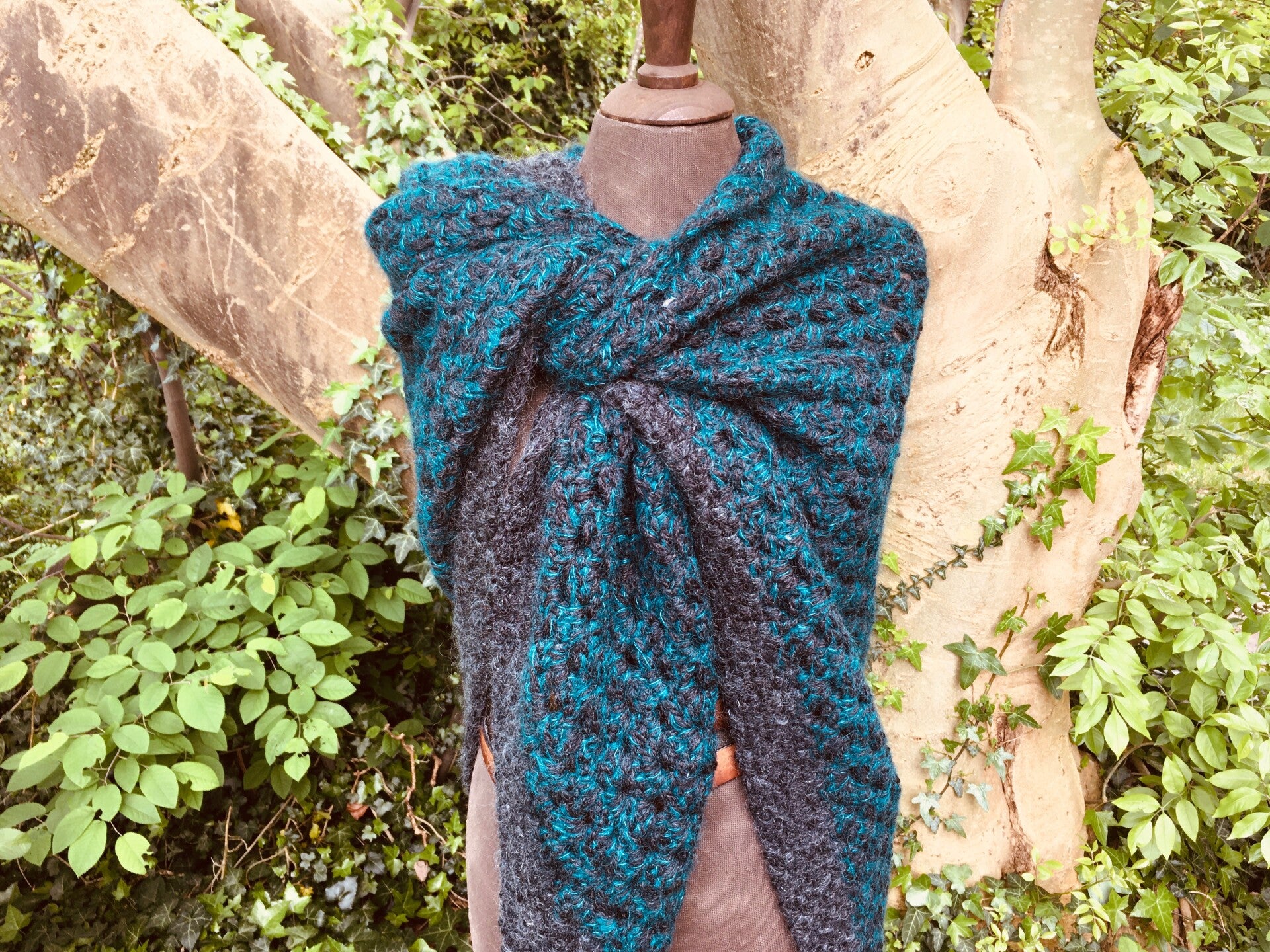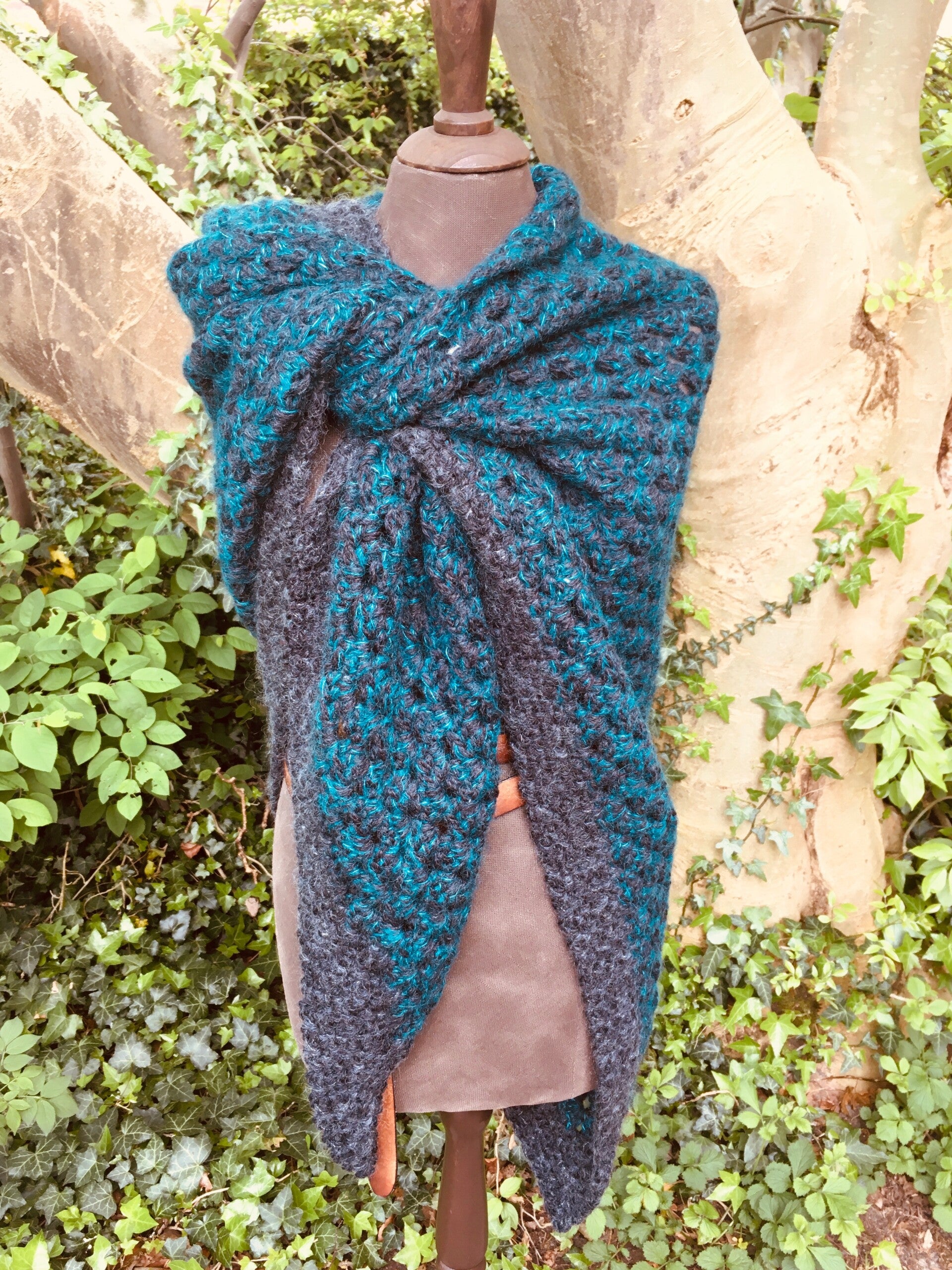 Deze supergrote omslagdoek is extreem zacht en lekker warm. Hij is mooi effen grijs met een leuke rand met gekleurde stippeltjes. Ondanks de grootte van de doek voelt hij in het geheel niet zwaar aan, maar licht en prettig. Hij is gehaakt van drie verschillende garens, dat geeft de kleureneffecten en het fijne gevoel - als een knuffel dus.