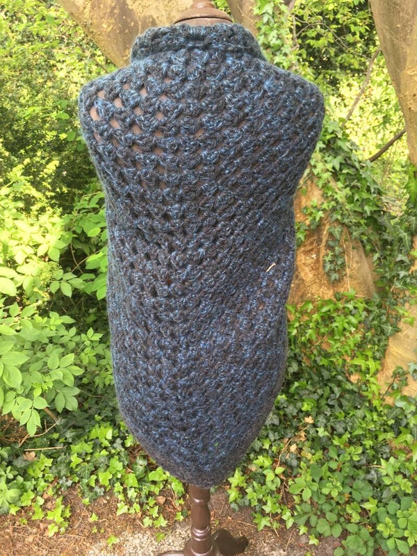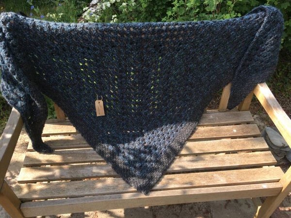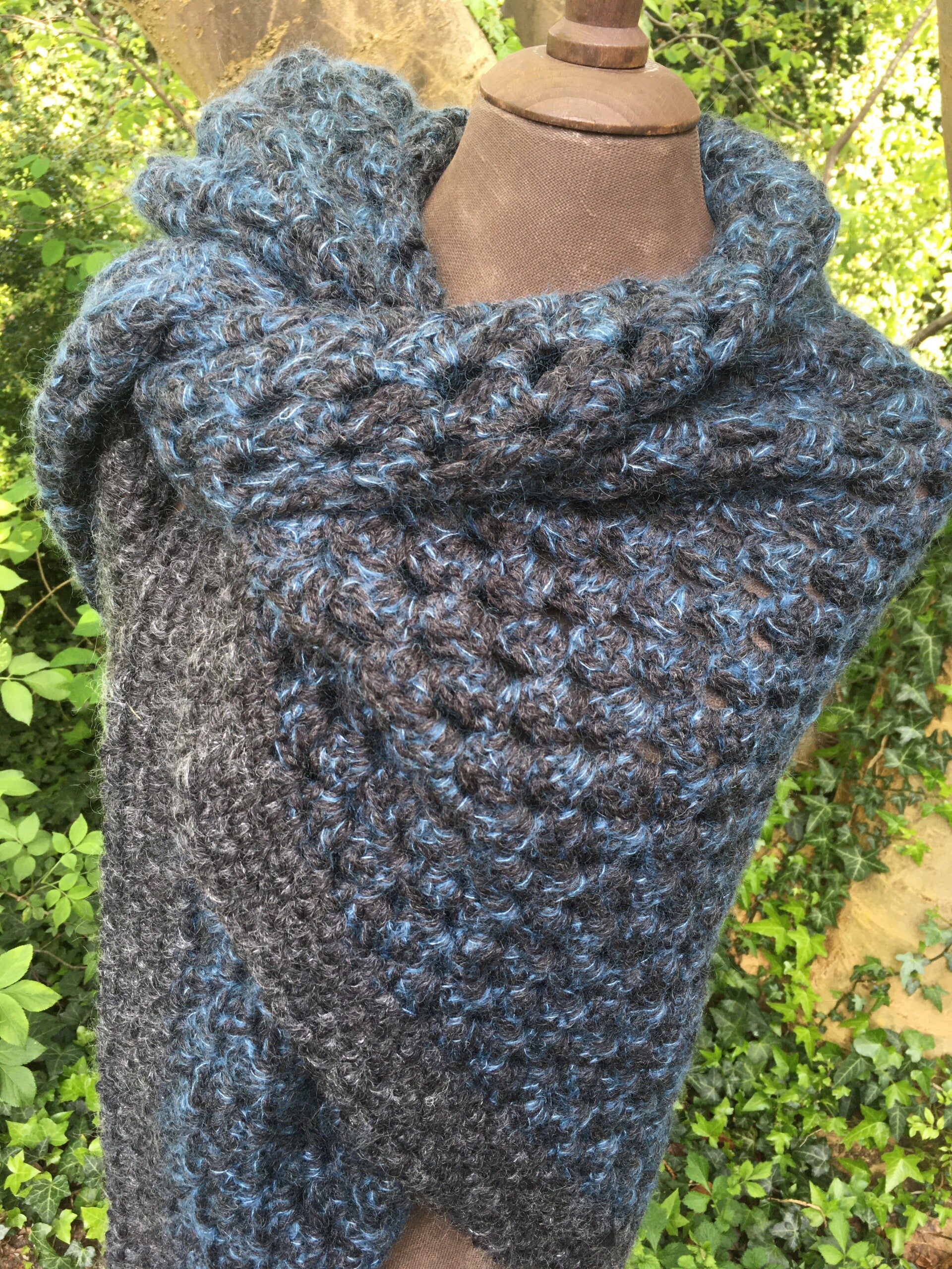 Deze supergrote omslagdoek is extreem zacht en lekker warm. Hij is mooi effen grijs met een leuke rand met gekleurde stippeltjes. Ondanks de grootte van de doek voelt hij in het geheel niet zwaar aan, maar licht en prettig. Hij is gehaakt van drie verschillende garens, dat geeft de kleureneffecten en het fijne gevoel - als een knuffel dus.