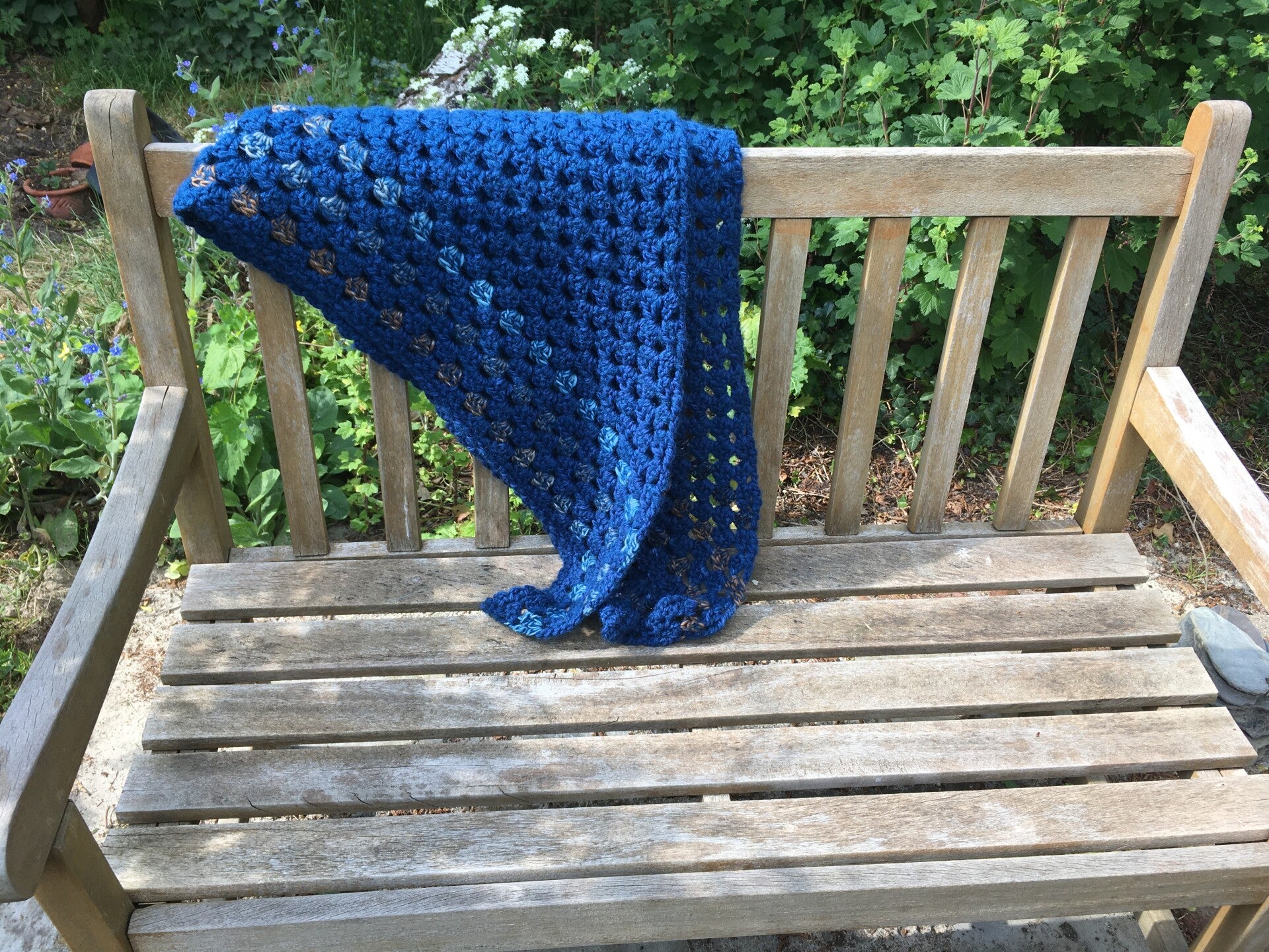 Driehoekige, supergrote omslagdoek, extreem zacht door de combinatie van diverse draden. Hij is een 'warme' kleur donkerblauw met een blokkenrand in lichtbruine & lichtblauwe kleuren. Ondanks de grootte van de doek voelt hij in het geheel niet zwaar aan, hij draagt licht, prettig en echt als een knuffel.