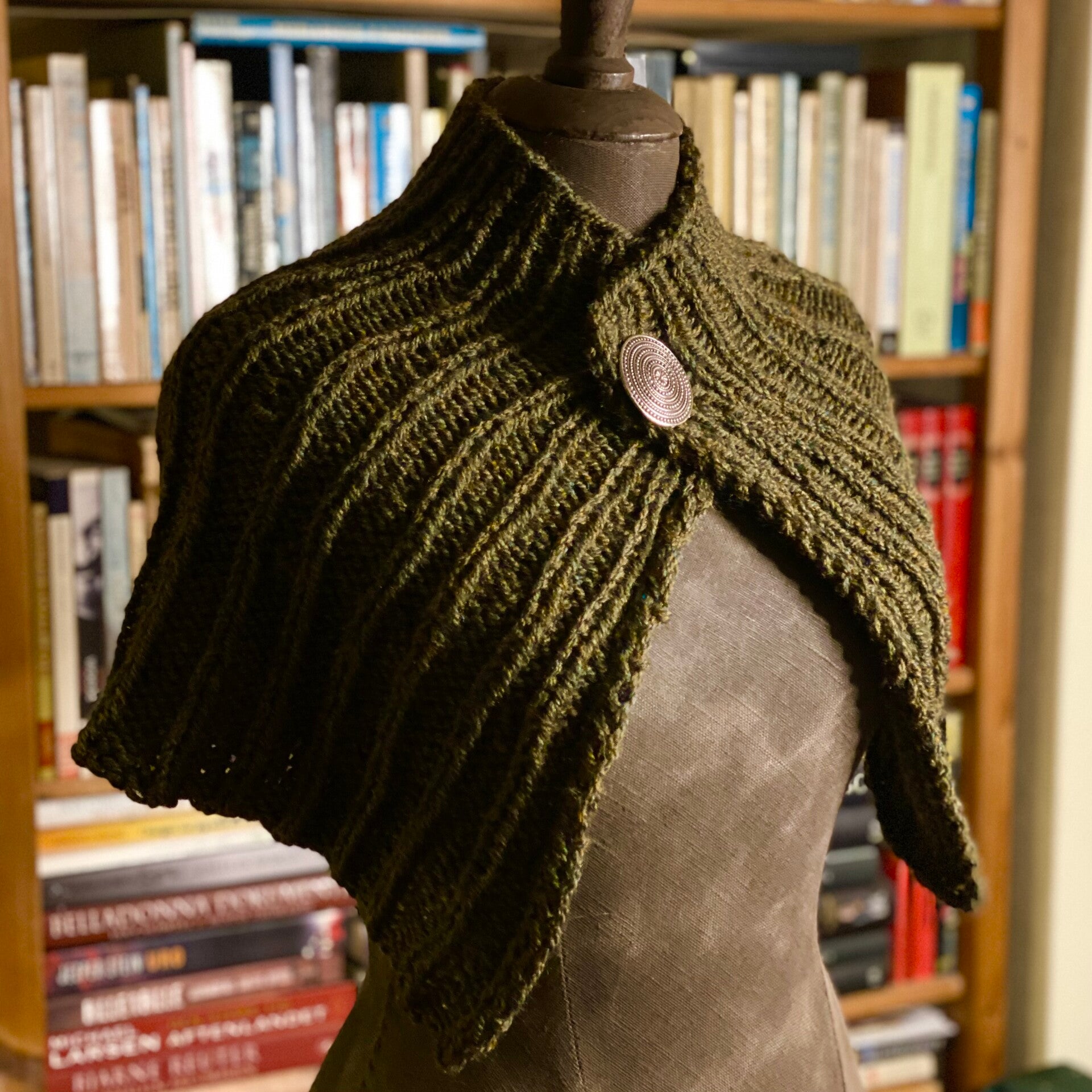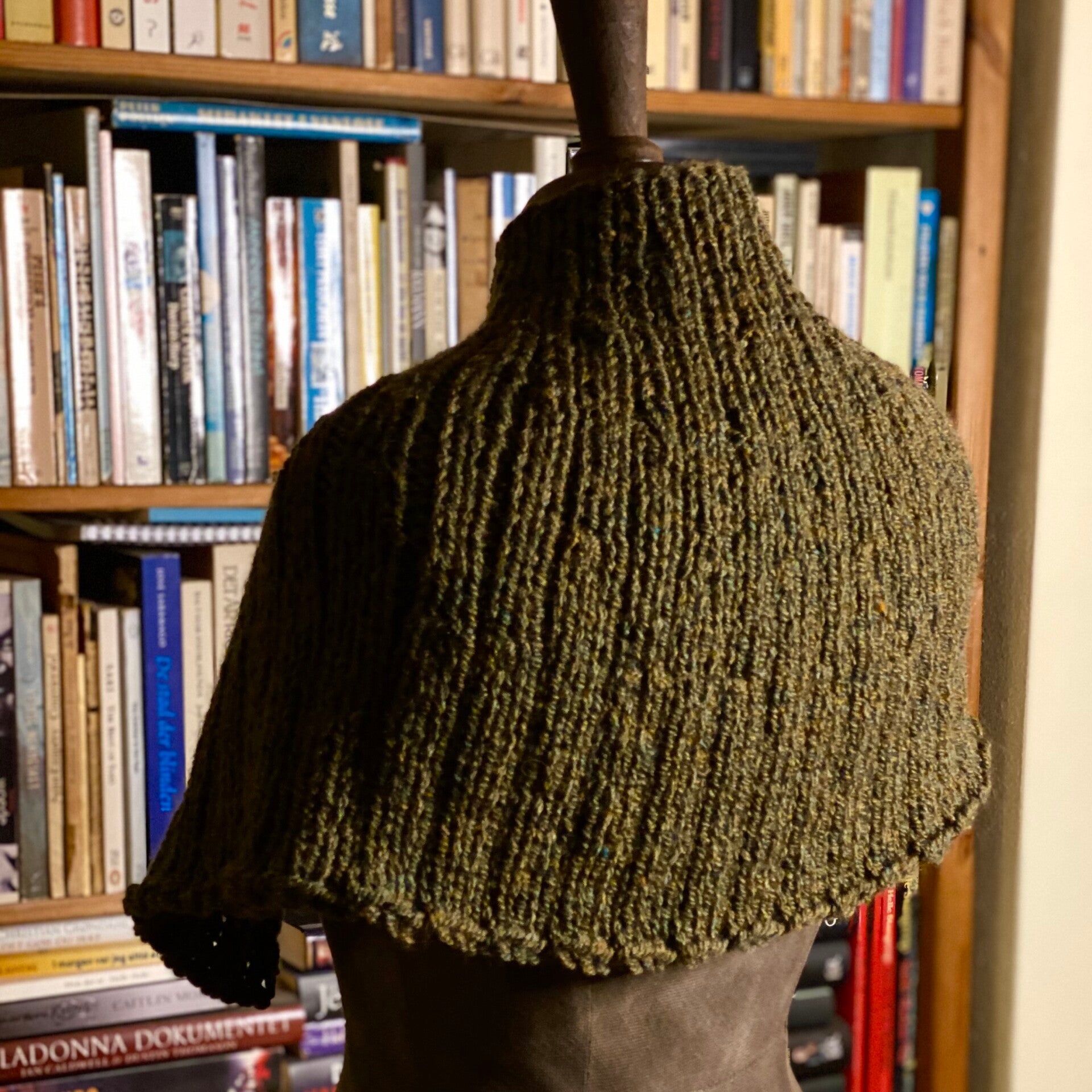 The capelet keeps the shoulders, upper back, breast and upper arms nice and warm. You can pull it closer or wear it looser around the neck, depending on how close you draw the sides together and where you put the brooch.