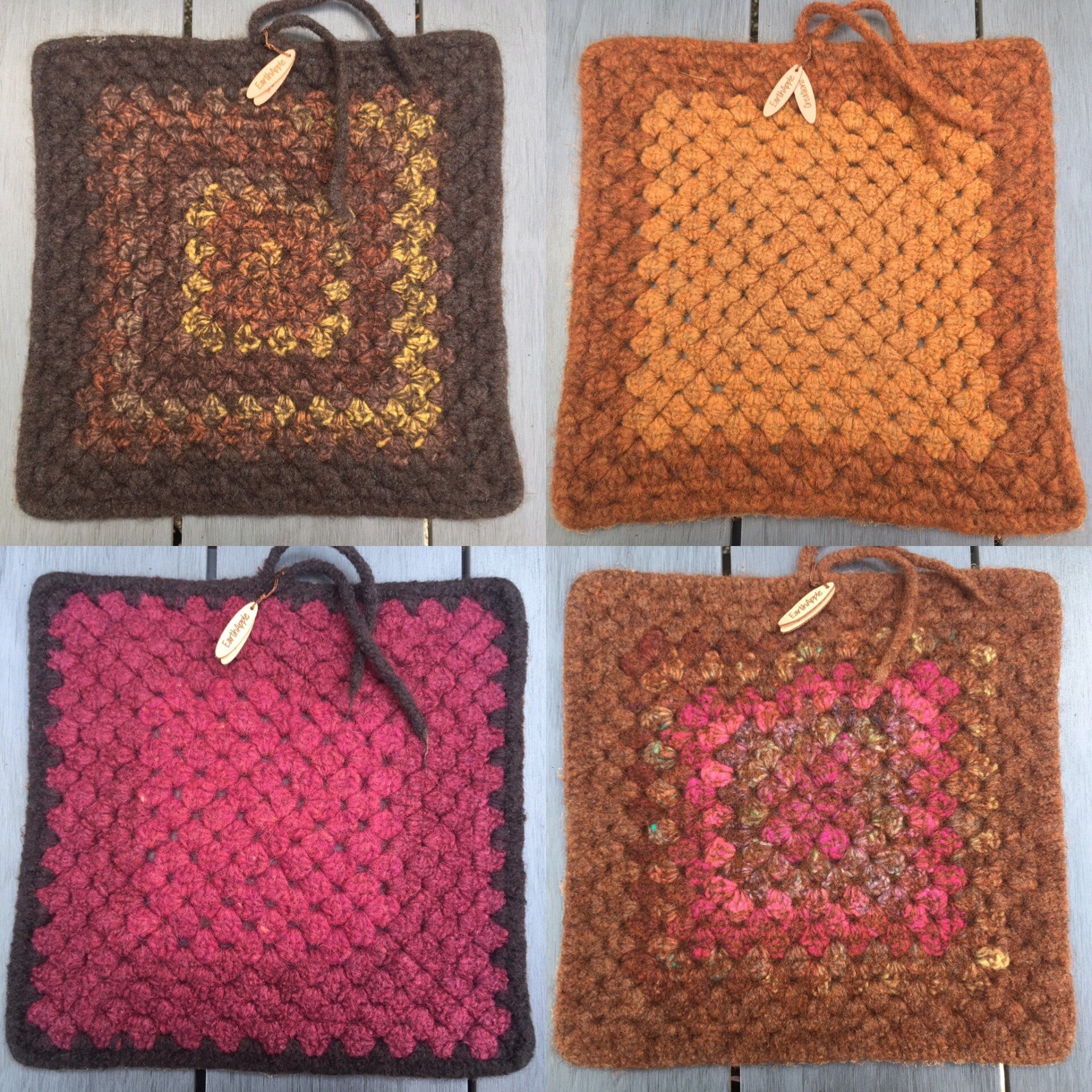 In essence, this mat is a very large granny square with reinforced edges and corners, and has been felted after crocheting. The result is a very pretty and very practical mat for just about all situations outside. The mat has a layer of natural rubber on the back so it is protected against damp grass.