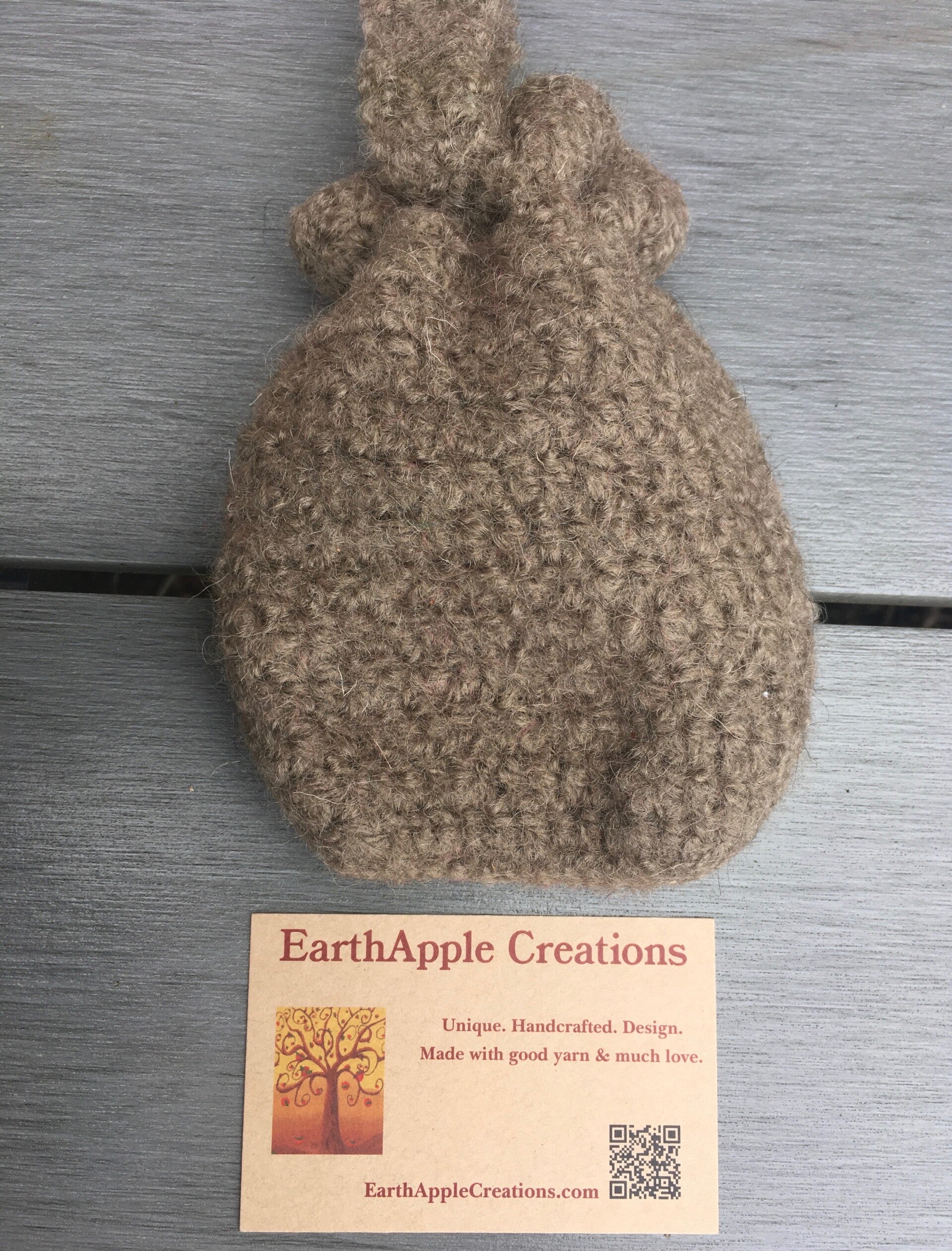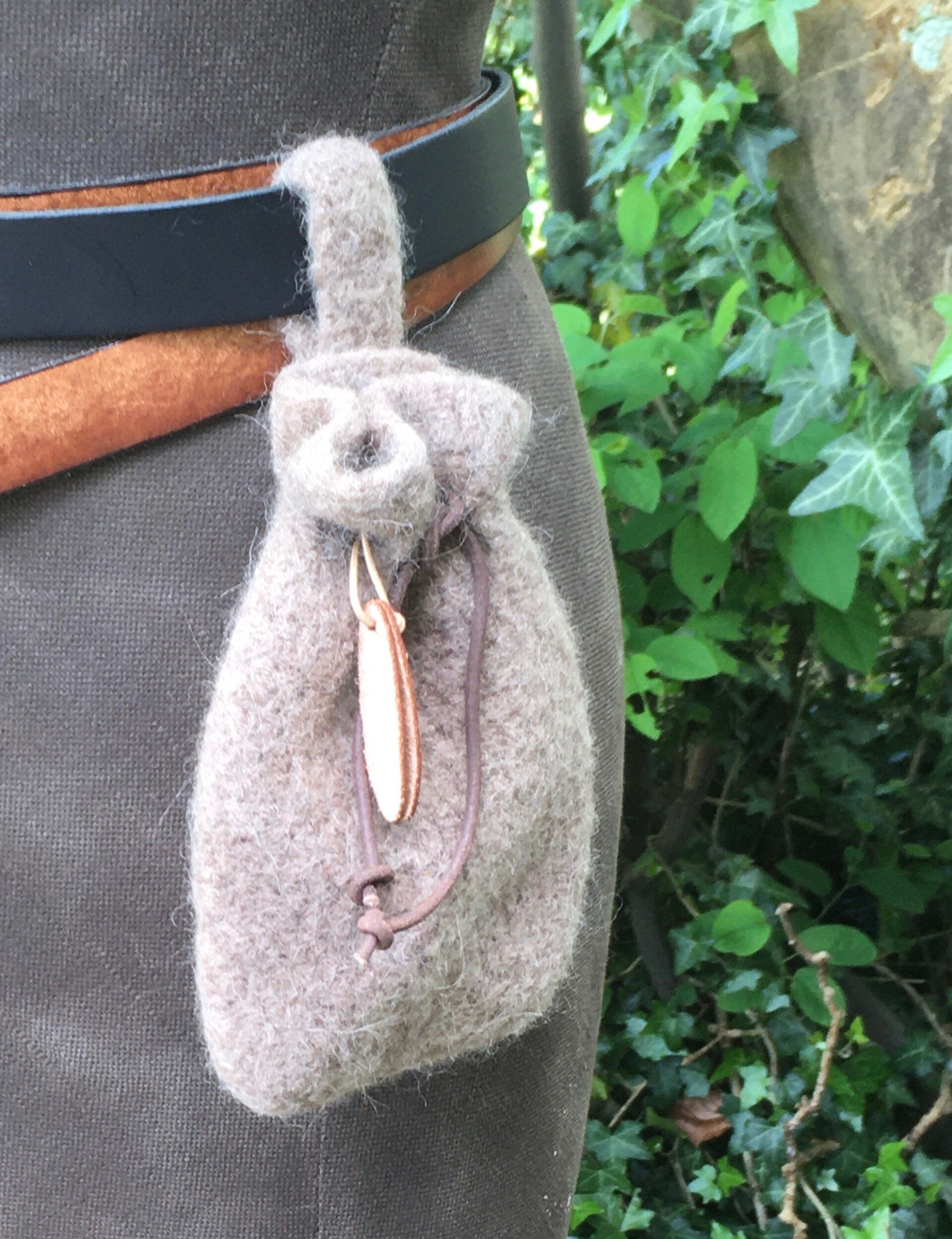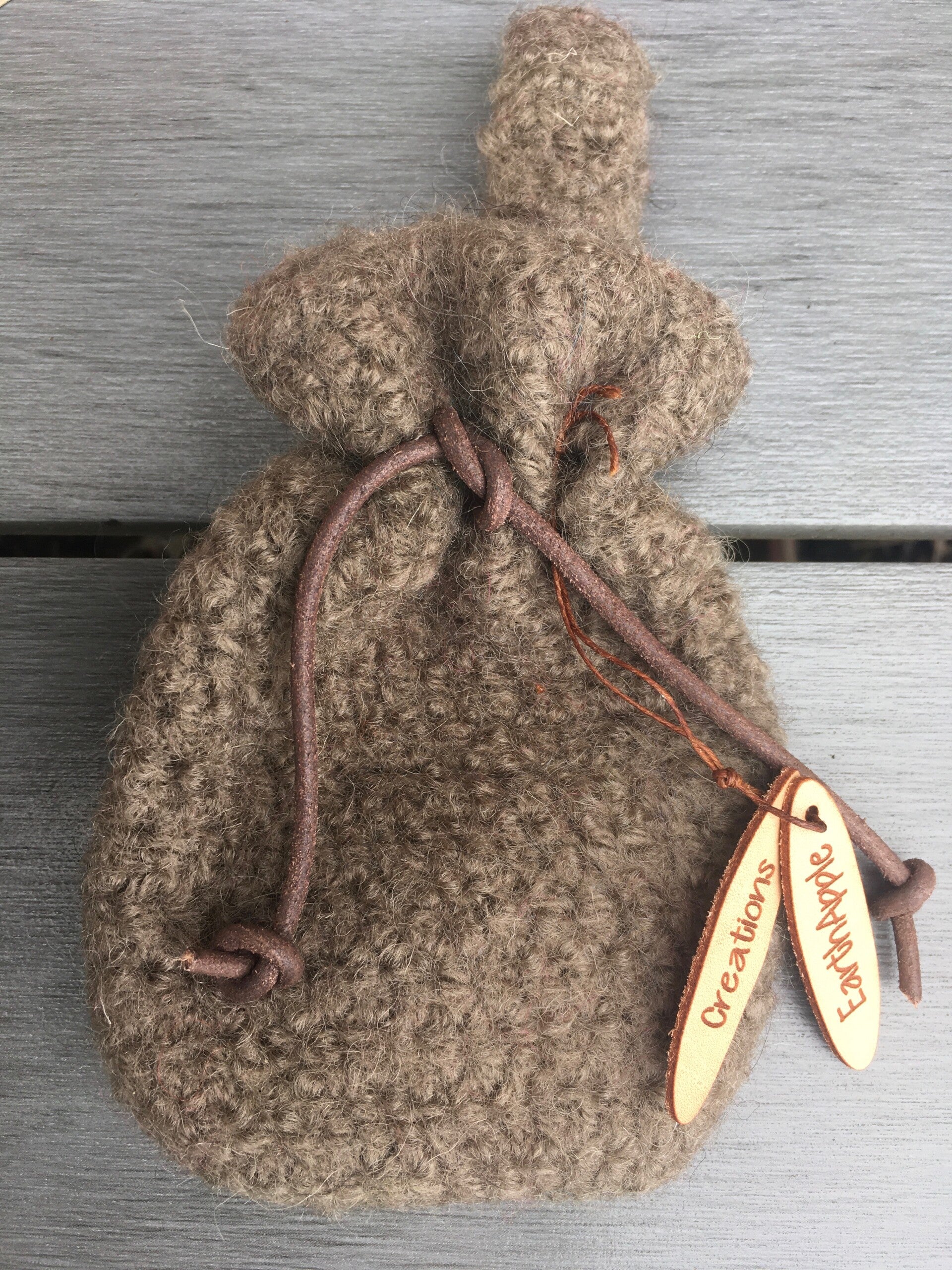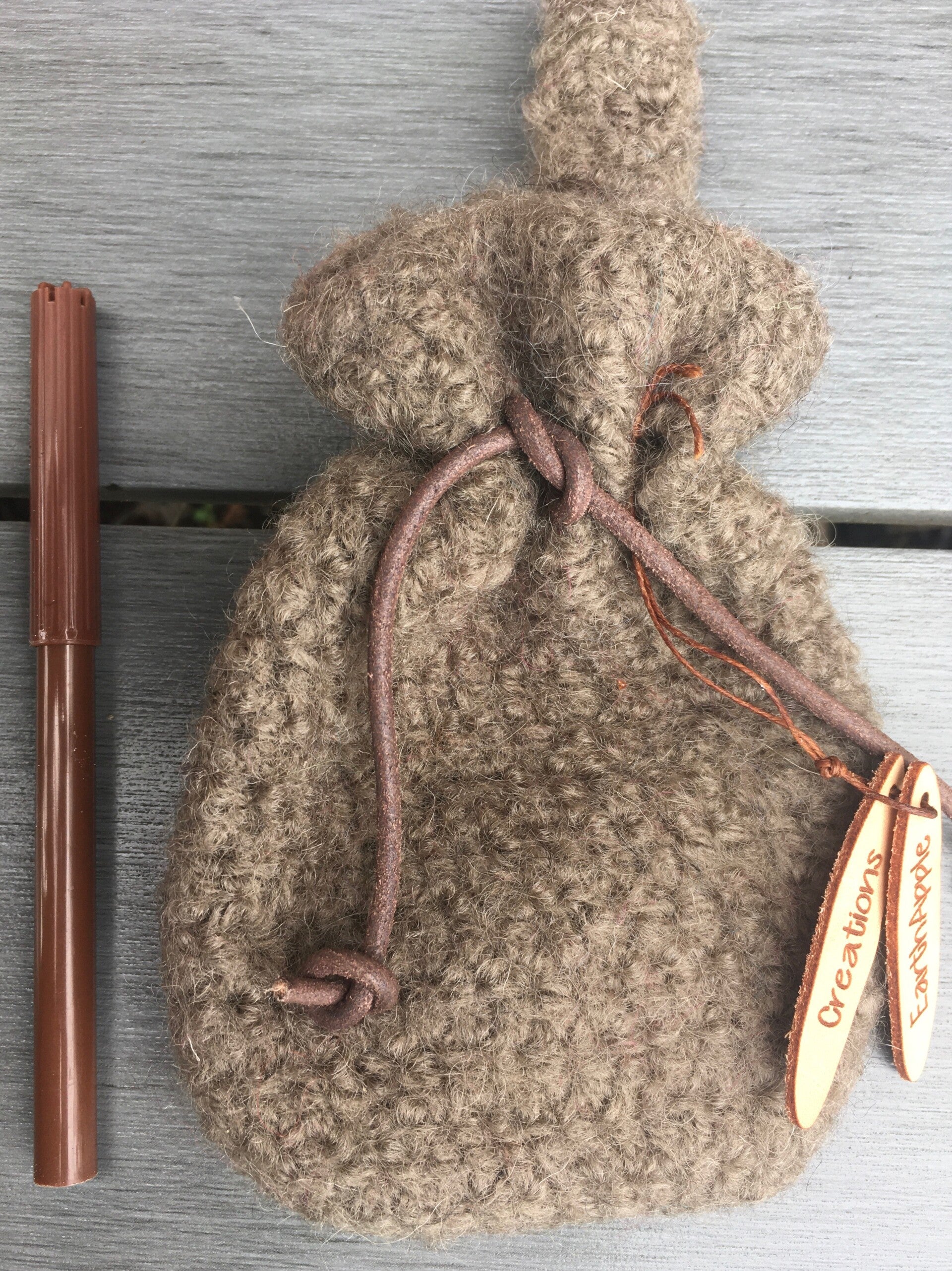 - Materials: Crocheted from 100% wool, then felted. Cord = leather.