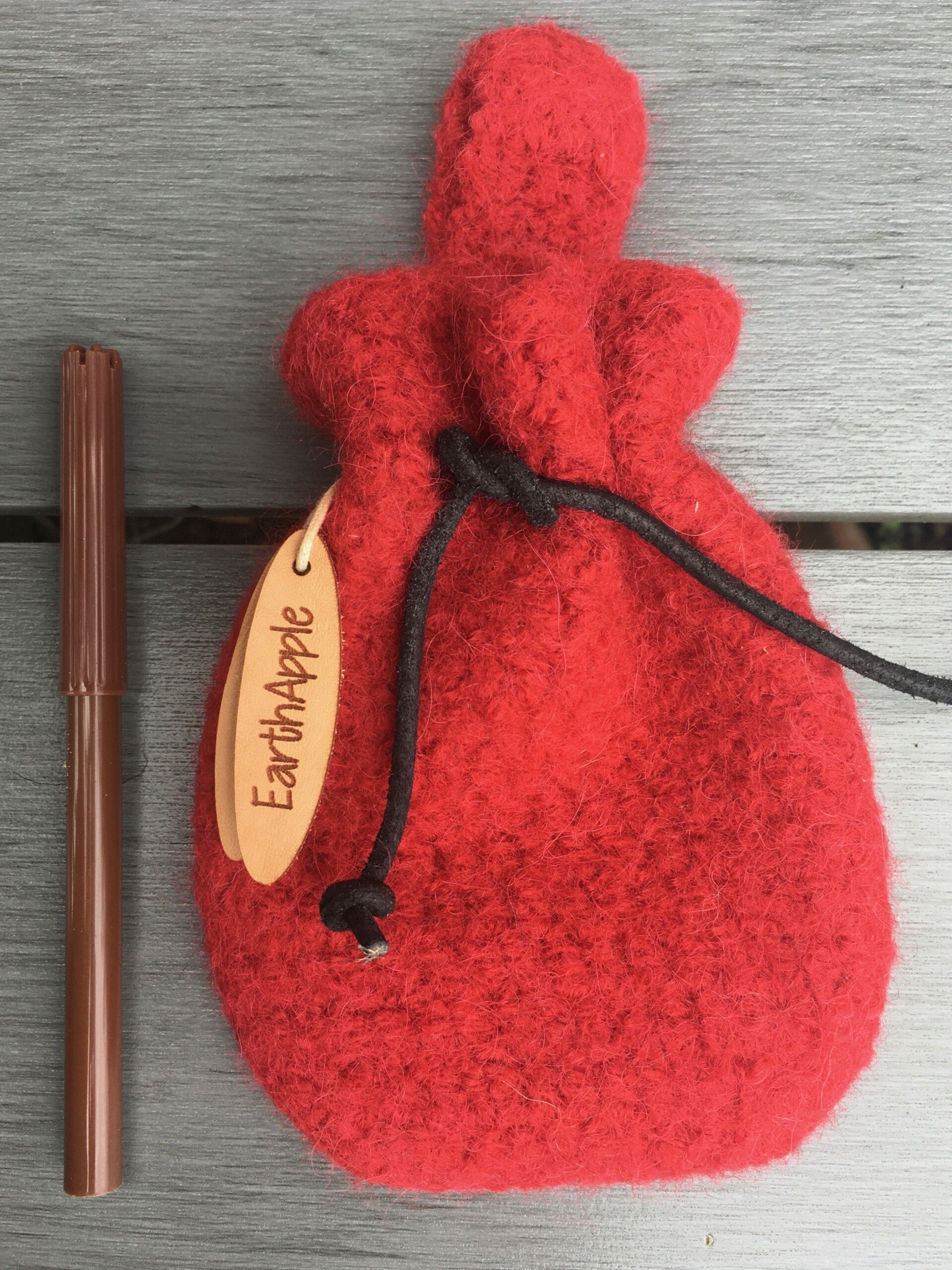 - Materials: Crocheted from 100% wool, then felted. Cord = leather.