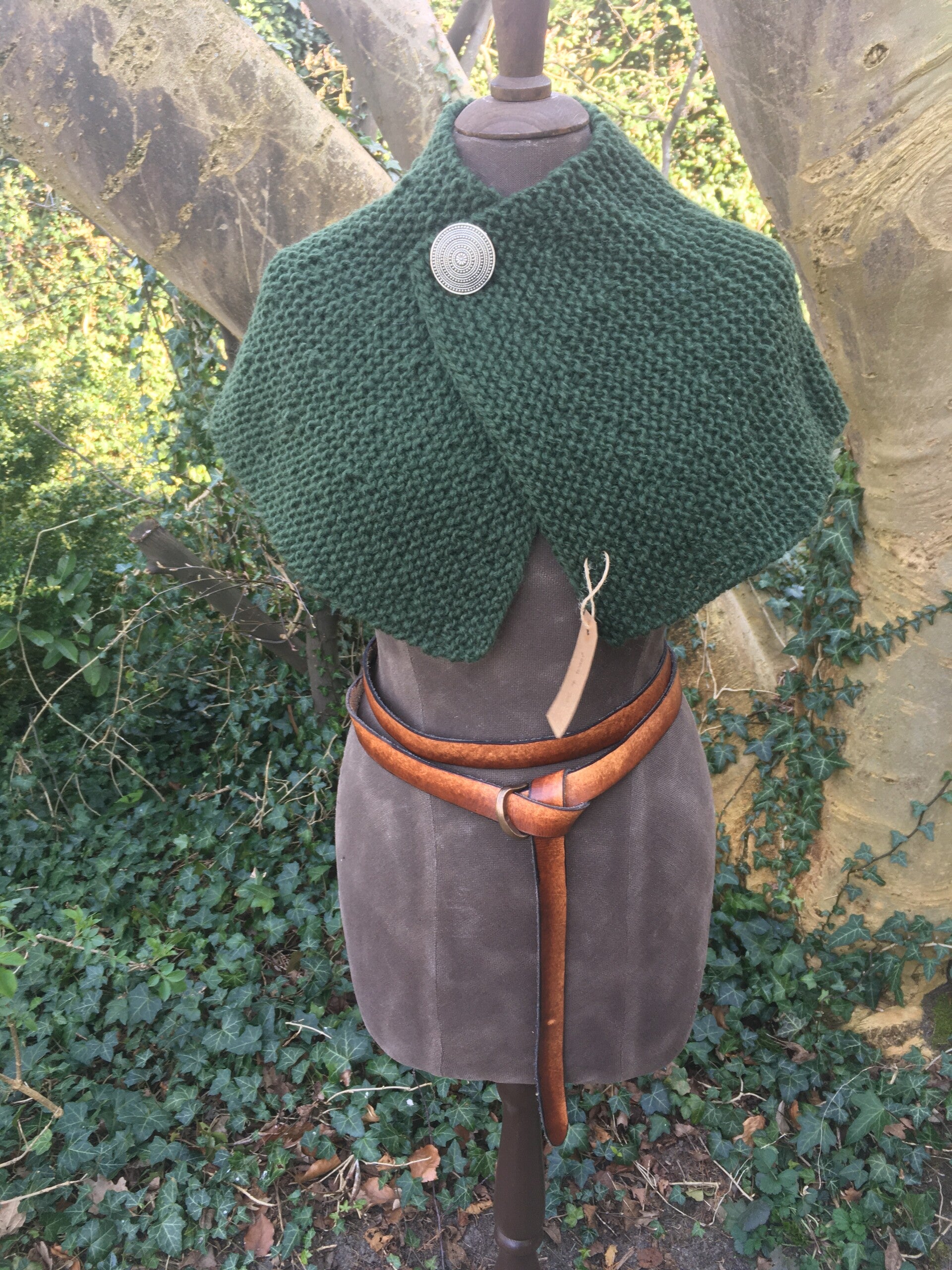 A round capelet, closing with a brooch (which you get with the capelet, colour of your choice). The capelet keeps the shoulders, upper back, breast and upper arms nice and warm. You can pull it closer or wear it looser around the neck, depending on how close you draw the sides together and where you put the brooch.