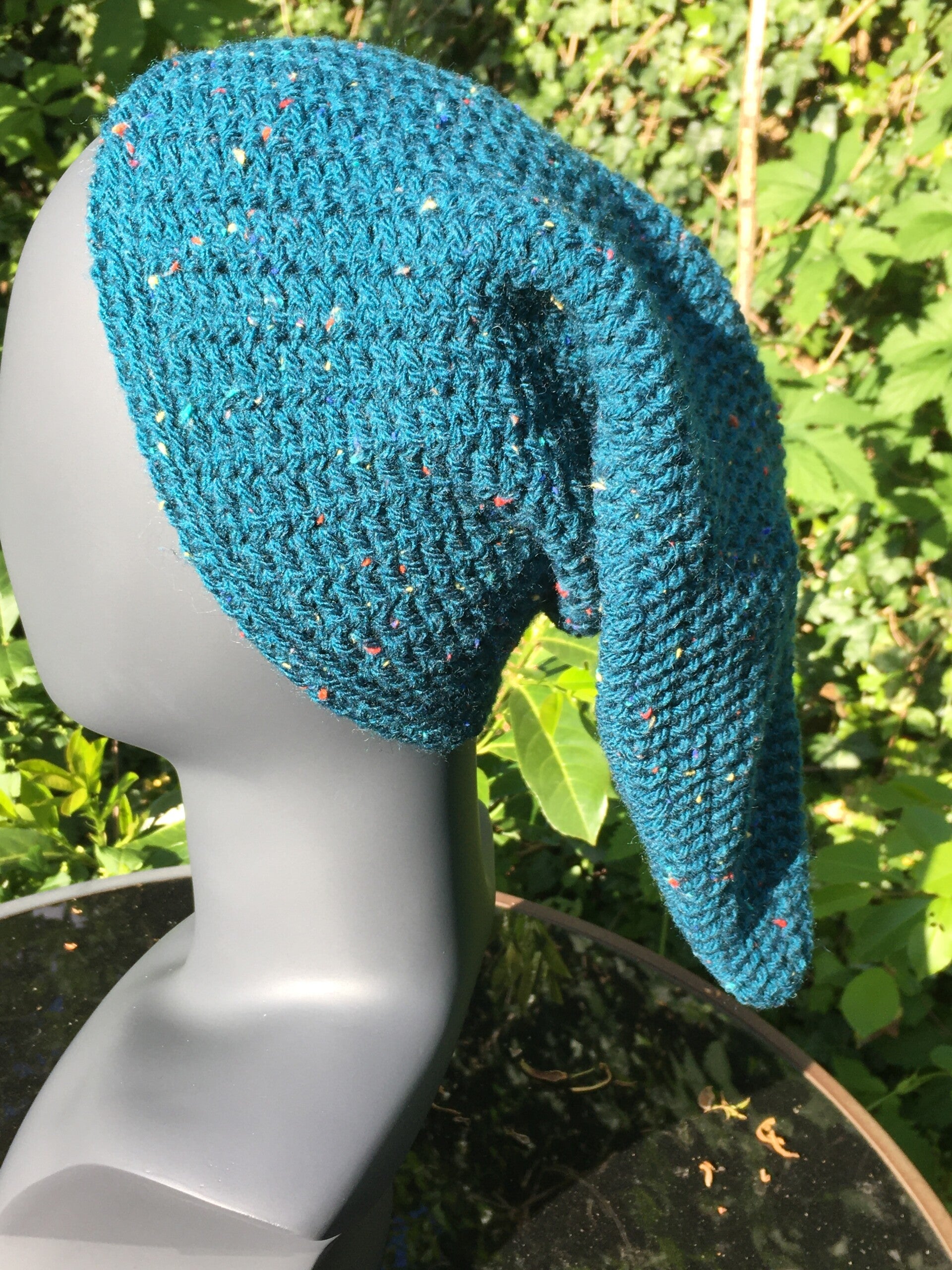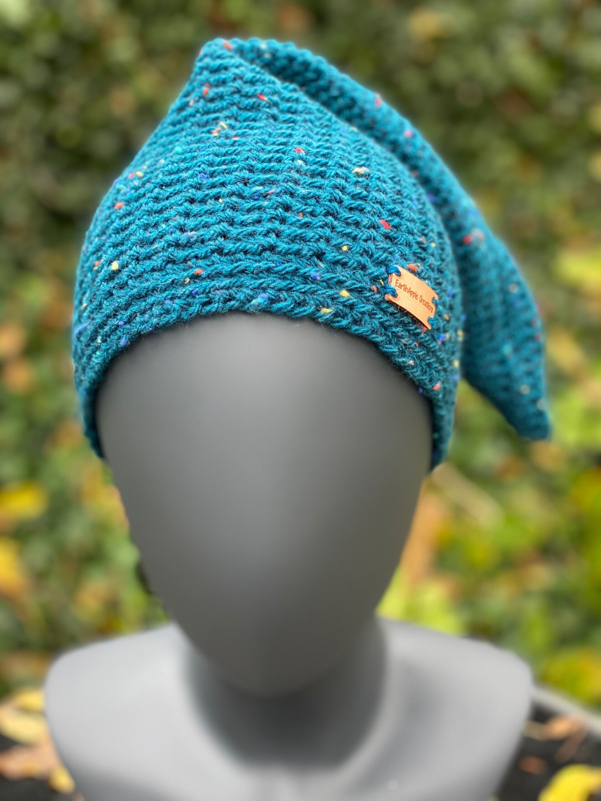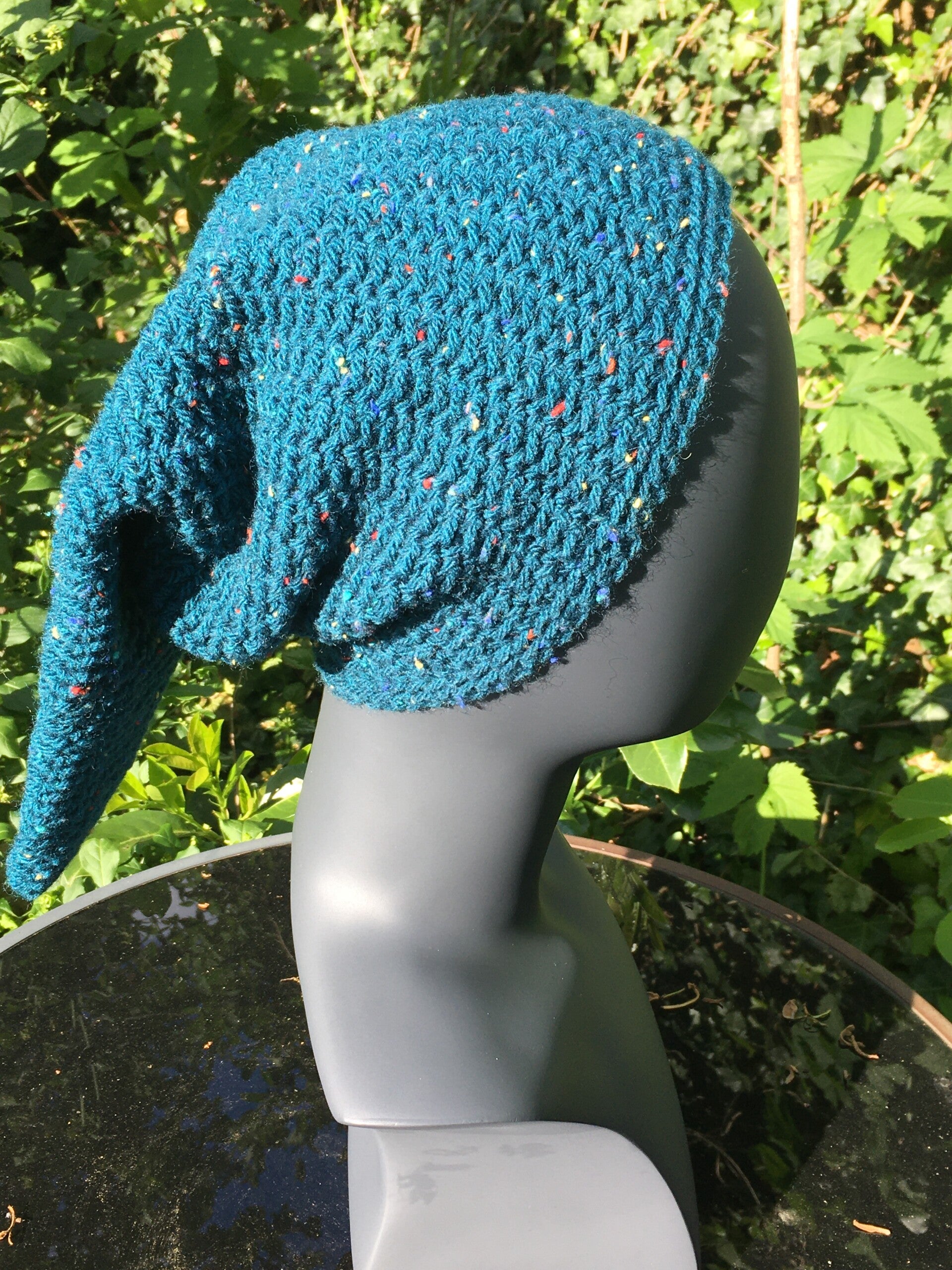 Wonderfully long, pointy beanie, shaped like the hats worn by the Danish "nisser": The little men and women who used to tease farmers, and who later, after the invention of Santa Claus, decided to help him. A whimsical beanie all in all.